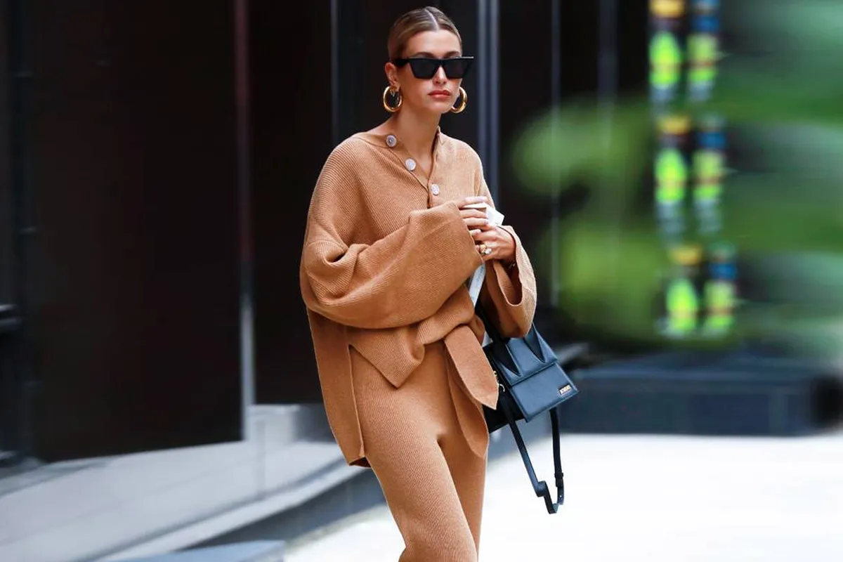 ارتدت هايلي المعطف البيج بقصة عسكرية مع بلوزة بيج وسروال فهي تحب الإطلالات المونوكروم وتدرك سبل تنسيقها فلا تقع في الرتابة. لذا نسقت الكنزة بياقة واسعة ووضعت نظاراتها المستطيلة القاتمة وتزينت باقراط ذهبية دائرية الشكل.