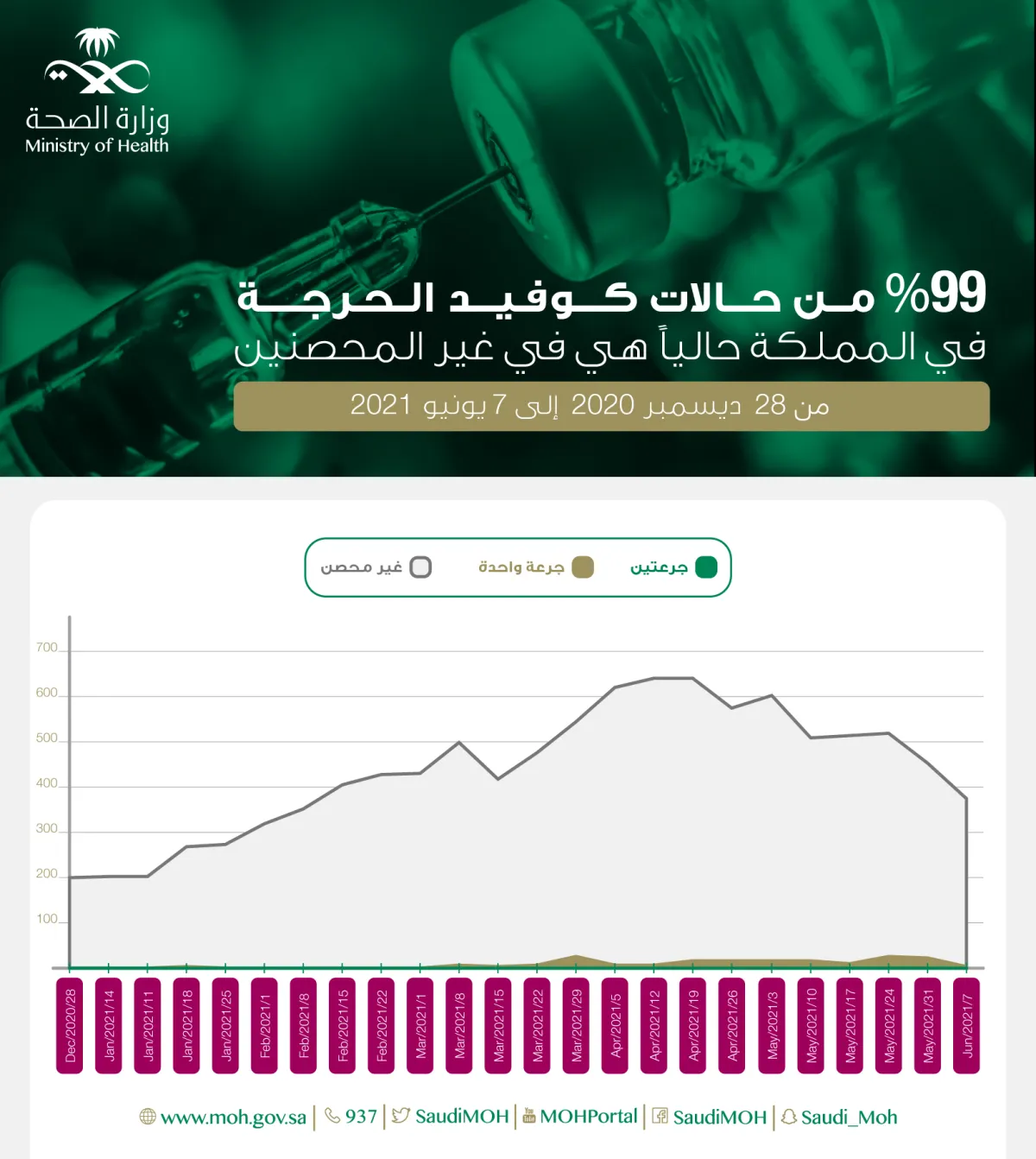كشفت وزارة الصحة السعودية، أن النتائج أظهرت بأن 99% من المصابين بفيروس كورونا المنومين في العناية الحرجة بالمملكة، لم يتلقوا لقاح كورونا.