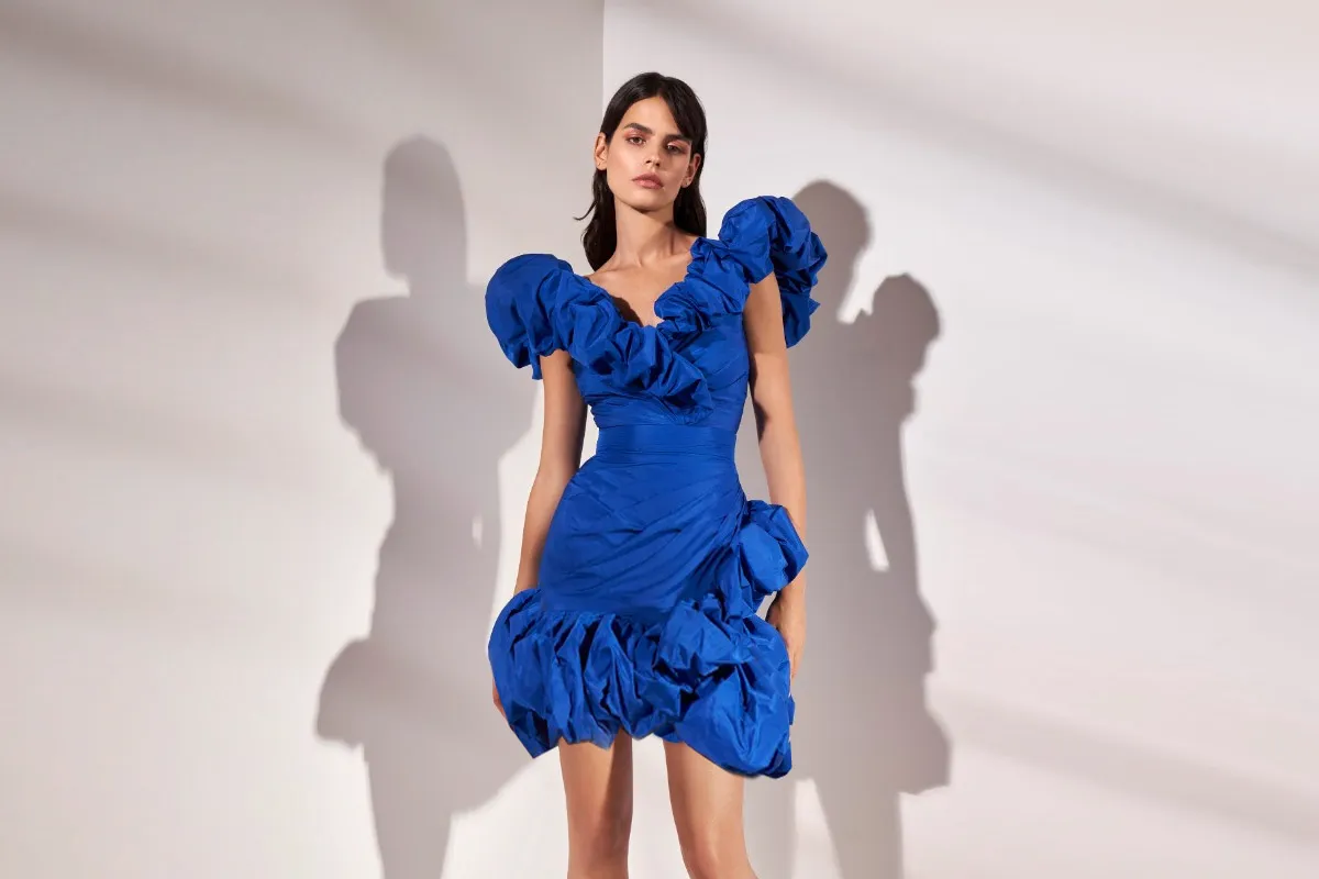 قدمت دار زهير مراد Zuhair Murad موديلات عديدة لفساتين راقية تعشقها النساء، ولكي تتألقي بمظهر أنثوي وأنيق؛ اخترنا لكِ هذا الفستان الجريء المُصمَّم من الكشكش باللون الأزرق، وصُمِّم من أكتاف منفوشة من الكشكش المنسدل حتى الصدر، وجاءت التنورة بتصميم قصير A Line من الكشكش المنفوخ وجاء الفستان من القماش الكريب.