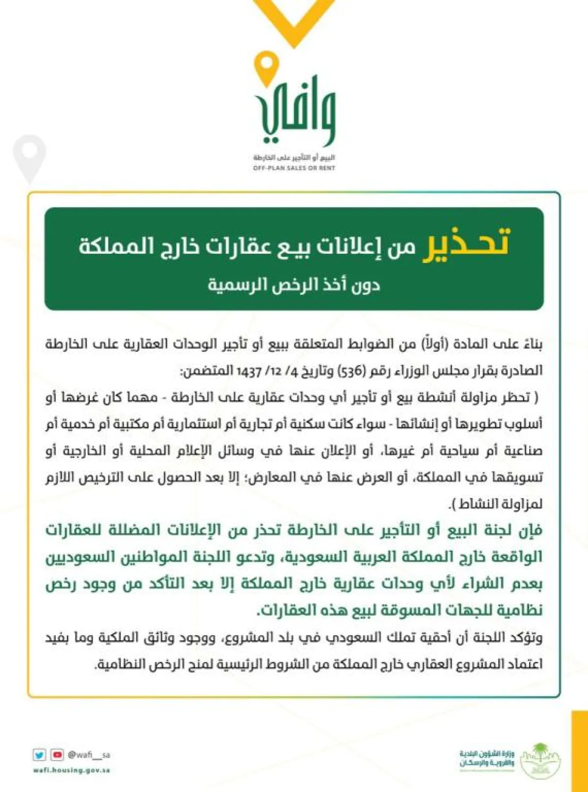 حذر برنامج البيع والتأجير على الخارطة "وافي" التابع لوزارة الشؤون البلدية والقروية والإسكان من الإعلانات المضللة لبيع العقارات الواقعة خارج المملكة دون الحصول على التراخيص النظامية اللازمة.