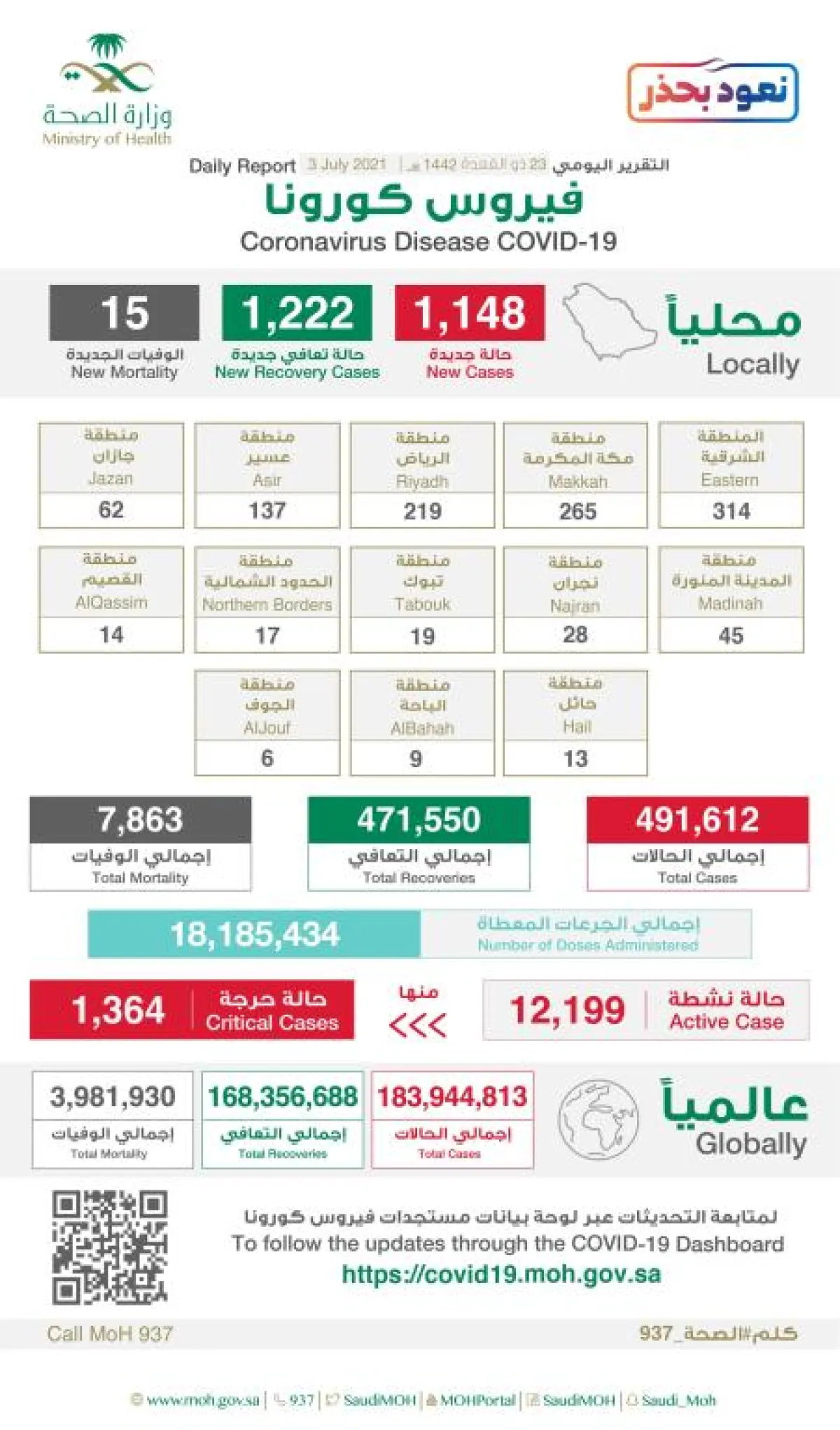 أعلنت وزارة الصحة إحصائية جديدة لمستجدات كورونا في المملكة خلال الـ24 ساعة الماضية تضمنت تسجيل (1148) حالة مؤكدة وتعافي (1222) حالة، فيما بلغ عدد الحالات النشطة (12199) حالة منها (1364) حالة حرجة.