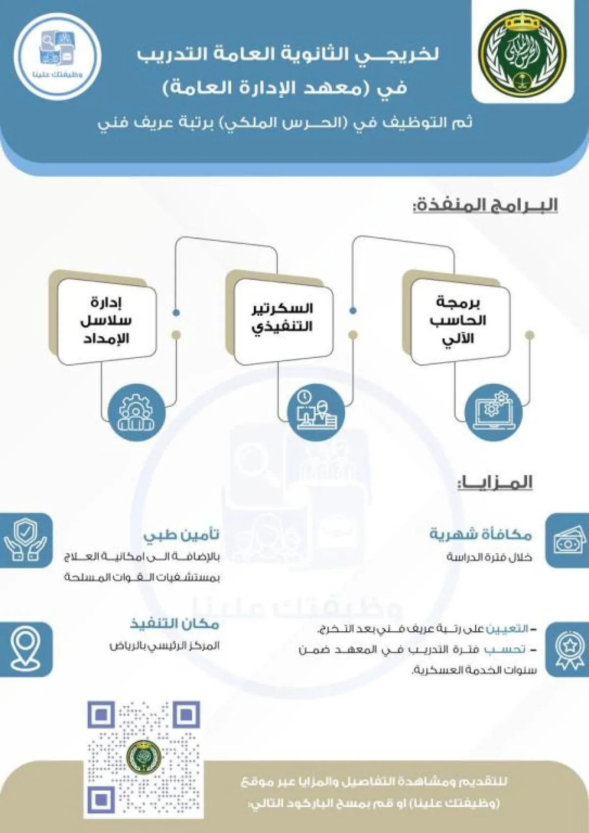 وأوضح الحرس الملكي، أن البرامج هي برمجة الحاسب الآلي والسكرتير التنفيذي وإدارة سلاسل الإمداد، مبينة أنه يشترط أن يكون المتقدم سعودي الأصل والمنشأ والولادة، وأن يكون حاصلاً على شهادة الثانوية العامة "قسم العلوم الطبيعية، وقسم العلوم الإدارية والاجتماعية، وقسم العلوم الشرعية".