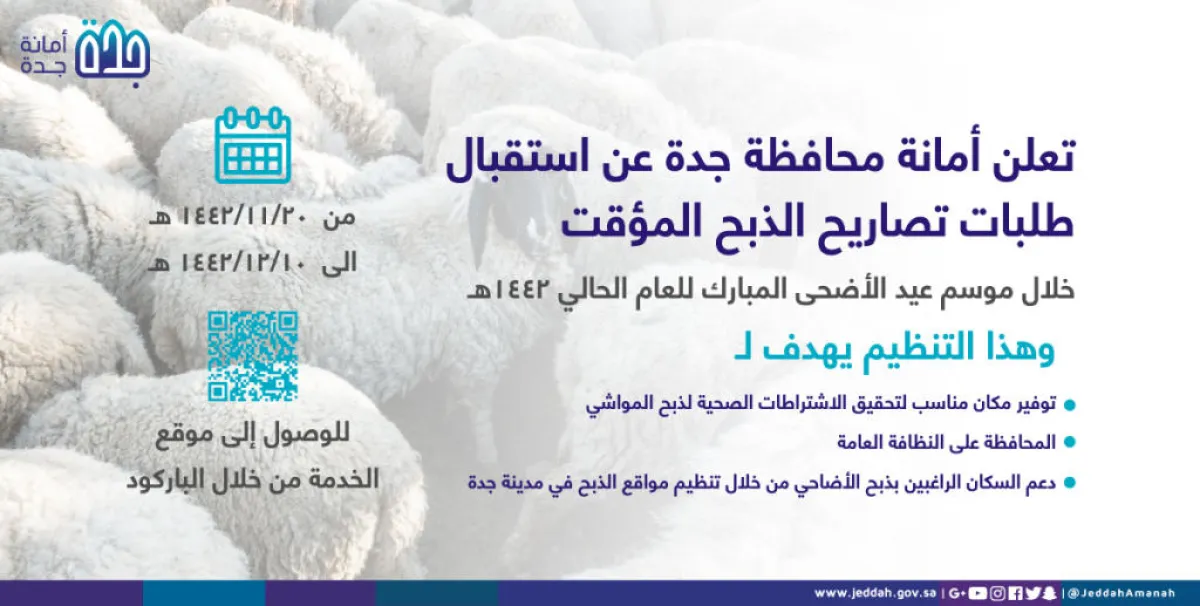 وتهدف أمانة جدة من هذا التنظيم إلى التخفيف على السكان بتوفير خيارات متعددة لأماكن الذبح خلال فترة العيد في المواقع النظامية التي تخضع للإشراف والرقابة، في حين تتيح التصاريح السماح للمطابخ المرخصة بالذبح المؤقت خلال أيام: (10 – 11 – 12 – 13) من عيد الأضحى المبارك وذلك وفق عدد من الاشتراطات اللازم توافرها والتي من أبرزها: (أن تكون رخصة المطبخ سارية المفعول – توفير طبيب بيطري مؤهل للكشف على المذبوحات – استيفاء جميع الاشتراطات الصحية الخاصة بالمطابخ والعاملين بها وفق الضوابط واللوائح الخاصة – توفير مكان مناسب يحقق الاشتراطات الصحية لذبح المواشي وسلخها ومرتبط بشبكة تصريف - إلى جانب النظافة الدائمة وغير ذلك من الاشتراطات المعتمدة).
