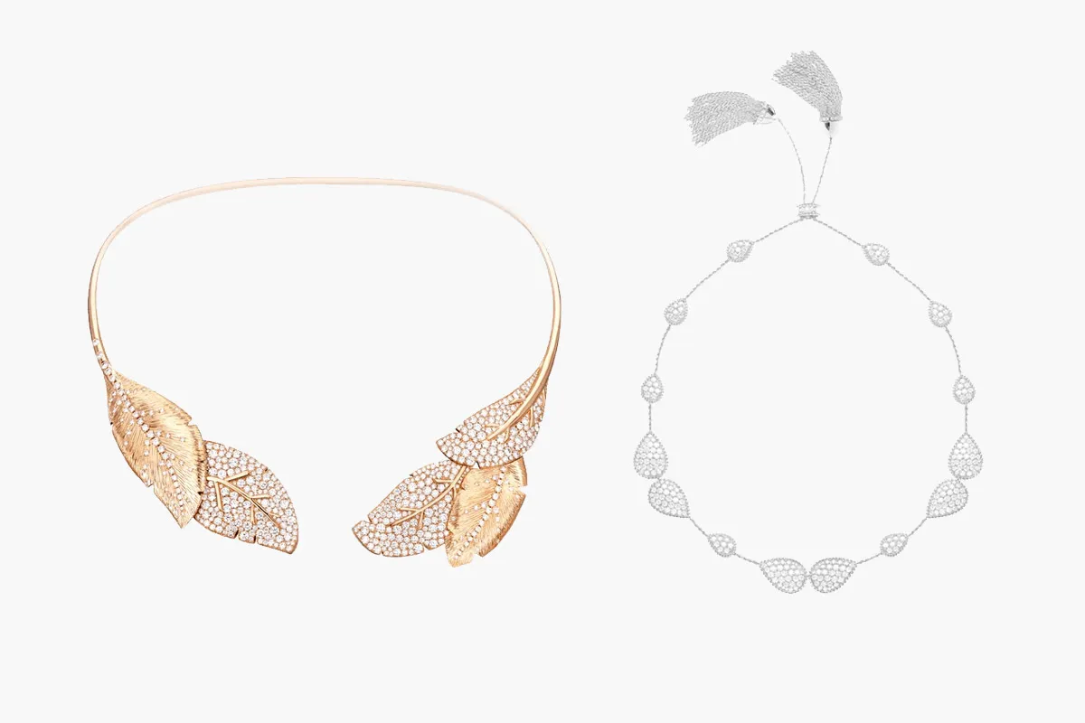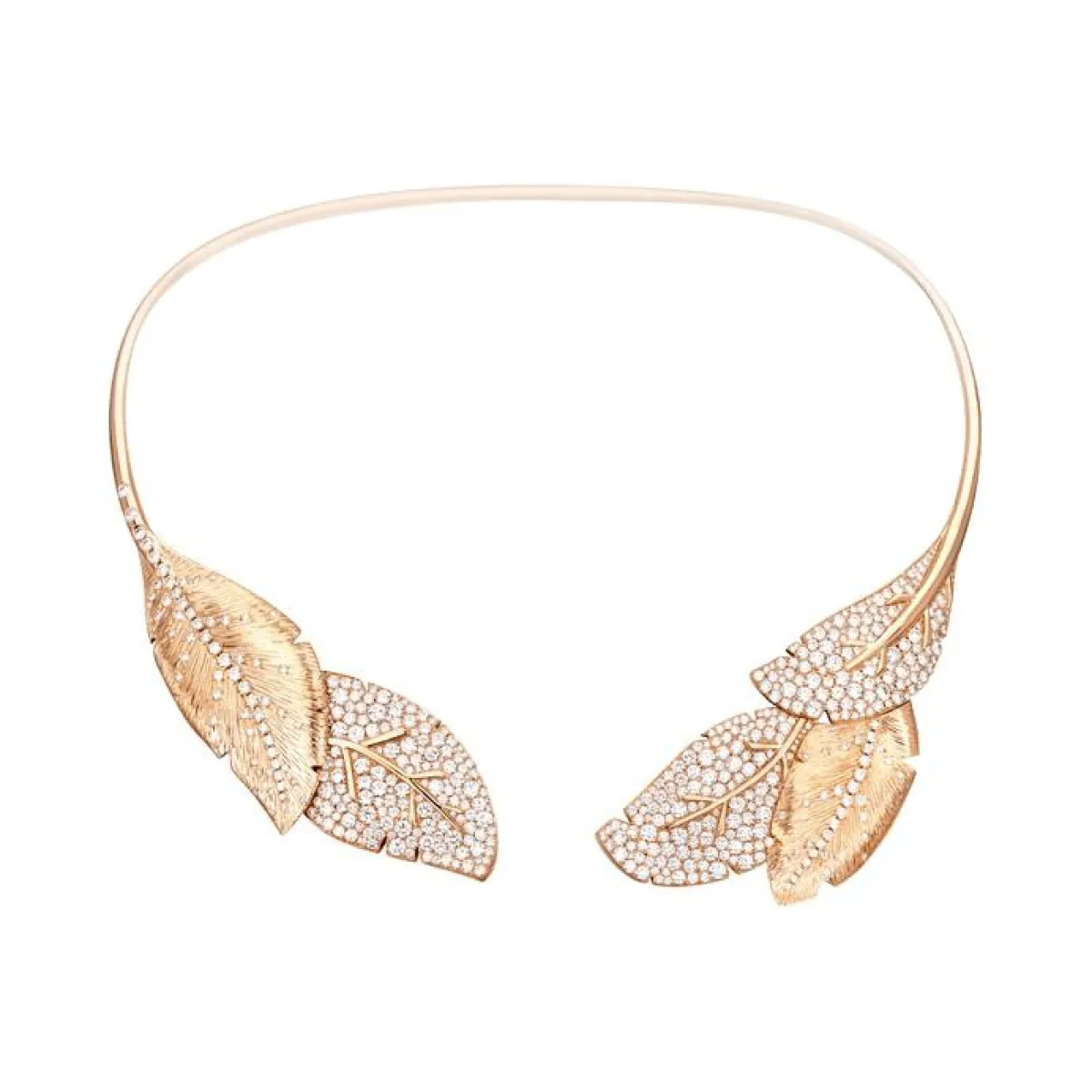وإذا كنتِ عروس وتبحثين بين أفخم العقود لترتديها في عيد الأضحي، نرشح لكِ هذا التصميم الراقي، لعقد مفتوح من ماركة بياجيه Piaget، صُمم من الذهب الوردي عيار 18 قيراط، بتصميم مستوحى من سعف النخيل، حيث تظهر أوراق شجرة النخيل على نهايات العقد الراقي، فيما جاءت هذه الأوراق مُرصعة بالألماس الأبيض، مما منح العقد تصميماً فخماً يخطف الأنظار.