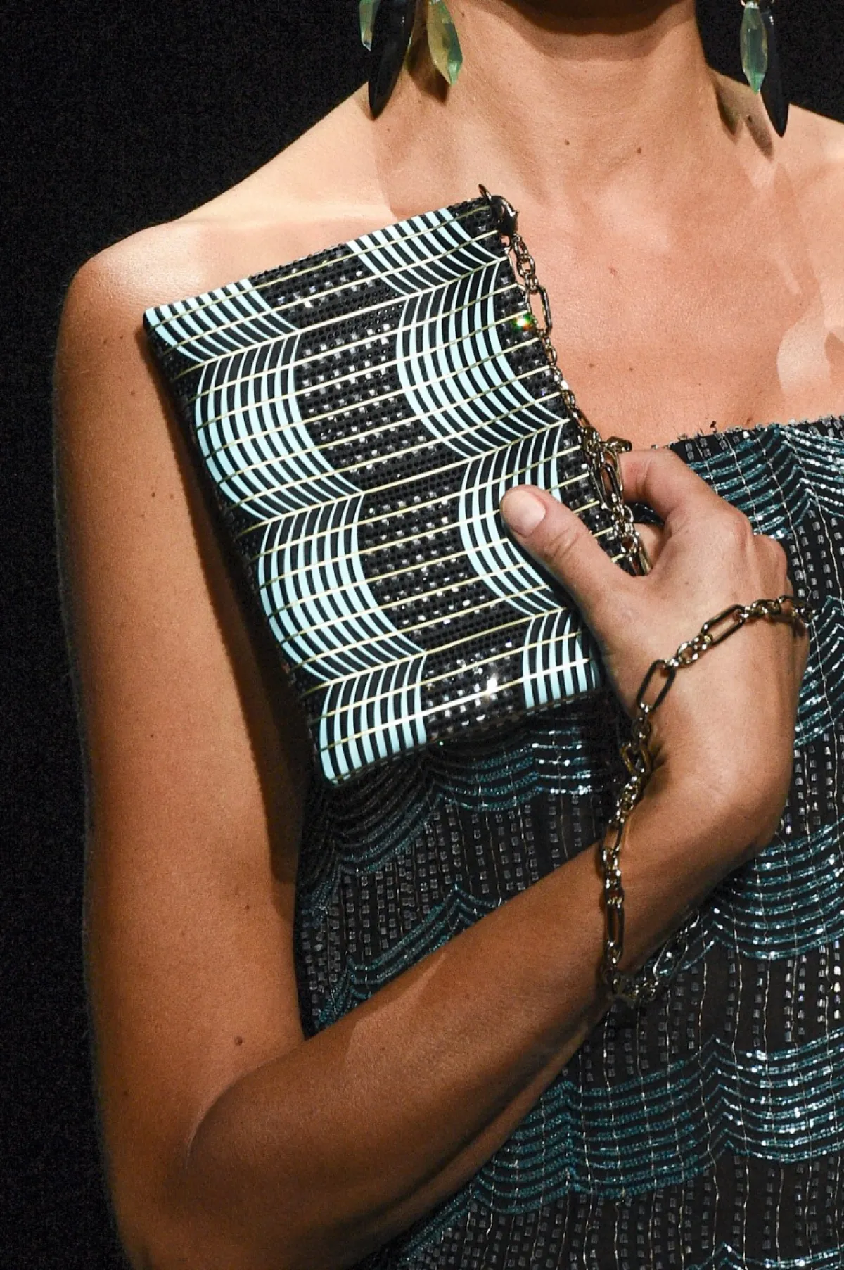 ويُمكنك اعتماد هذه الحقيبة مع إطلالة براقة بفستان ضيق من الساتان باللون الأزرق وصندل بكعب عالٍ باللون الأسود.
