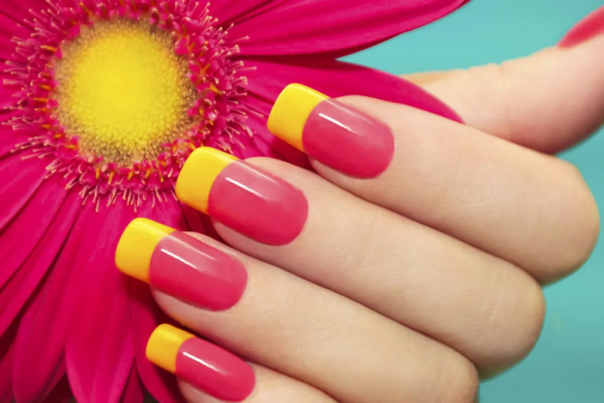 ولاضفاء لمسات ساحرة، يمكن اختيار الألوان المستوحاة من أشعة الشمس عند المغيب، وتطبيق مناكير أظافر فرنش باللون الأصفر الصارخ، مع اللون الزهري كلون أساسي للظفر.