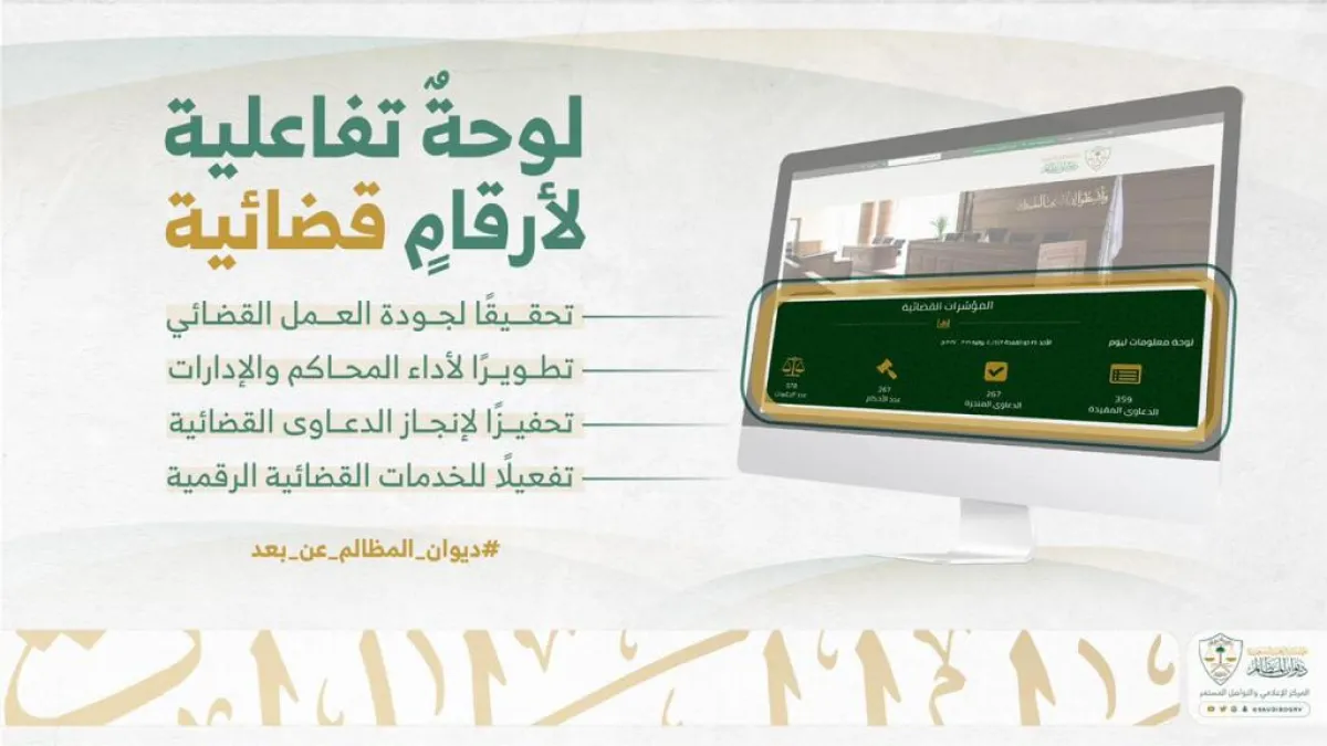 في إطار العمل الدؤوب الذي تقوم به إدارات الديوان ومحاكمه في توفير معلومات رقمية محدثة، تبرز جودة العمل القضائي وإنجازه، أظهرت لوحة المعلومات بالمؤشرات القضائية أداء الخدمات الرقمية لديوان المظالم، وتعد لوحة معلومات المؤشرات القضائية من أحدث الخدمات التفاعلية لديوان المظالم في البوابة الخارجية، إذ تستعرض الأرقام بشكل تفاعلي ولحظي.