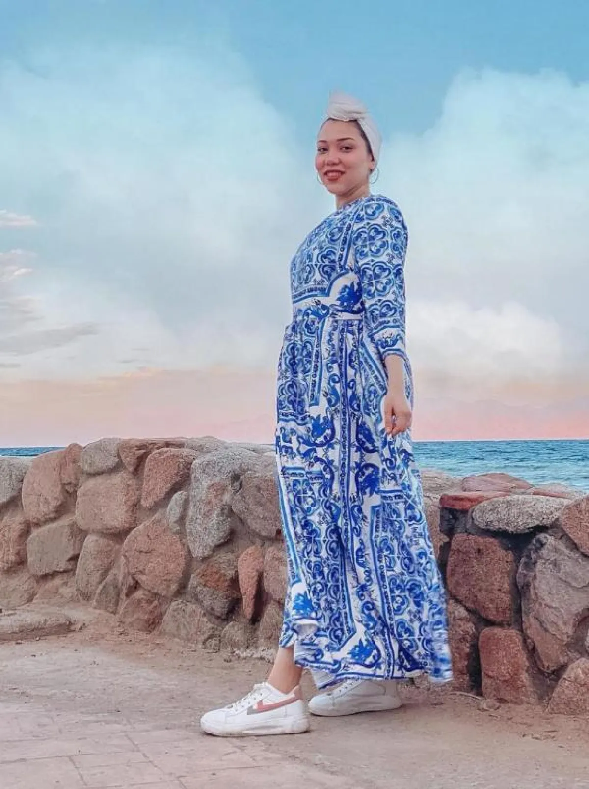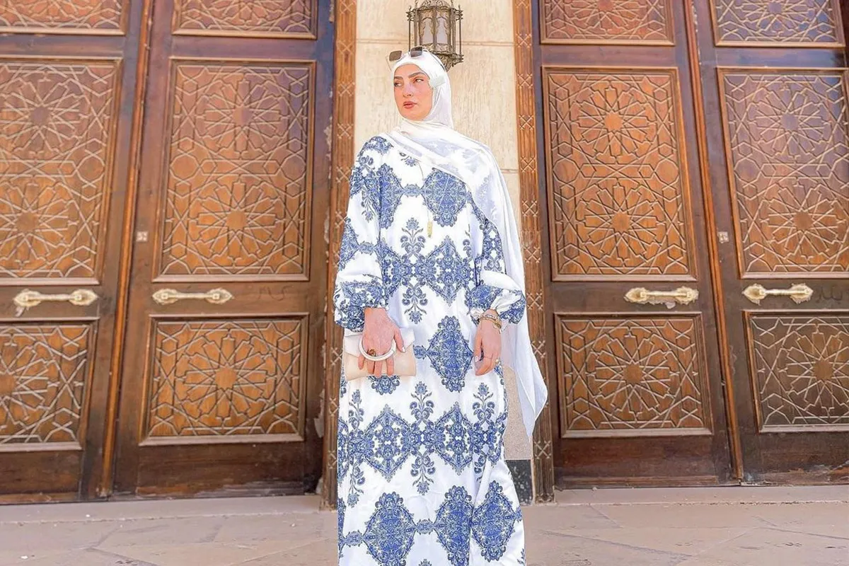 لجأت مدونة الموضة المصرية، ندى الدبركي، إلى فساتين اللون الأزرق لخيار حيوي مناسب لفصل الصيف، فإن كنتِ تنوين اعتماده في عيد الأضحى فيمكنك أن تطلّي بفستان أزرق بطبقات متعددة مع حزام بخصر سماوي وحجاب مطبع بعدة ألوان، أو ارتدي فستاناً أبيض مطبعاً بالنقوشات الزرقاء مع حجاب توربان وحذاء رياضي أبيض.