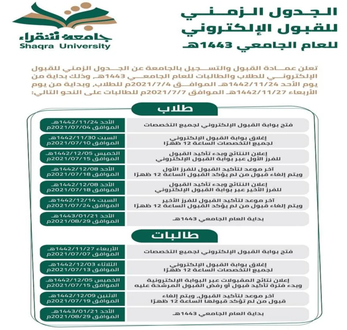 أعلنت جامعة شقراؤ اليوم عن فتح بوابة القبول الإلكتروني للطالبات ابتداءً من اليوم وحتى يوم الثلاثاء 1442/12/3هـ.