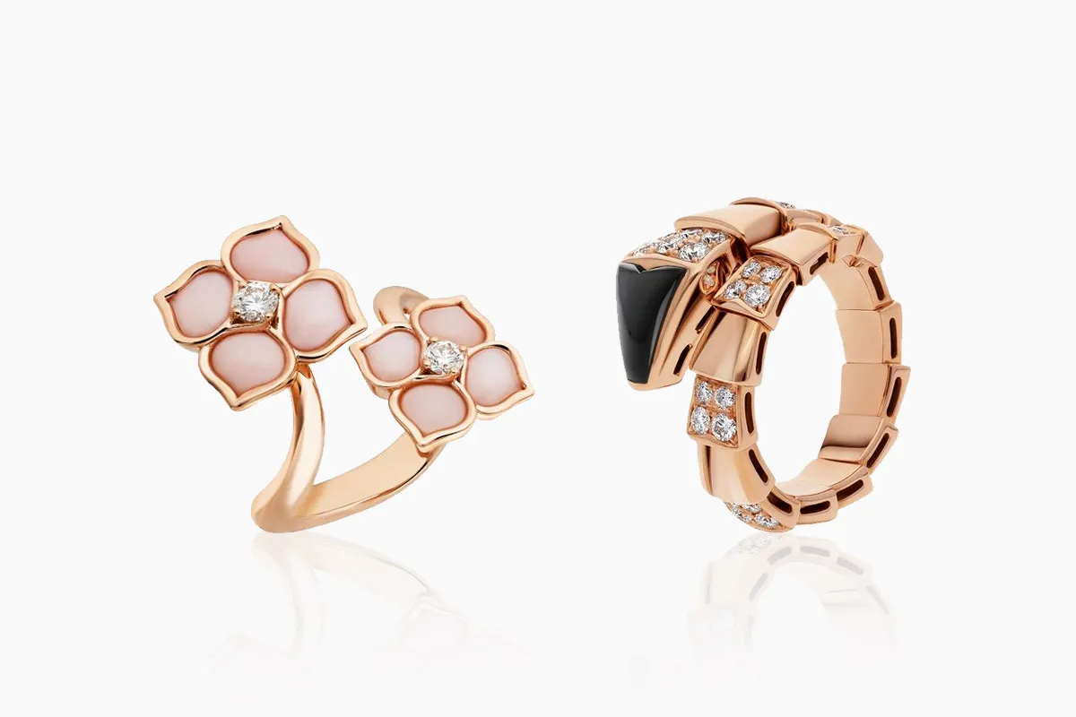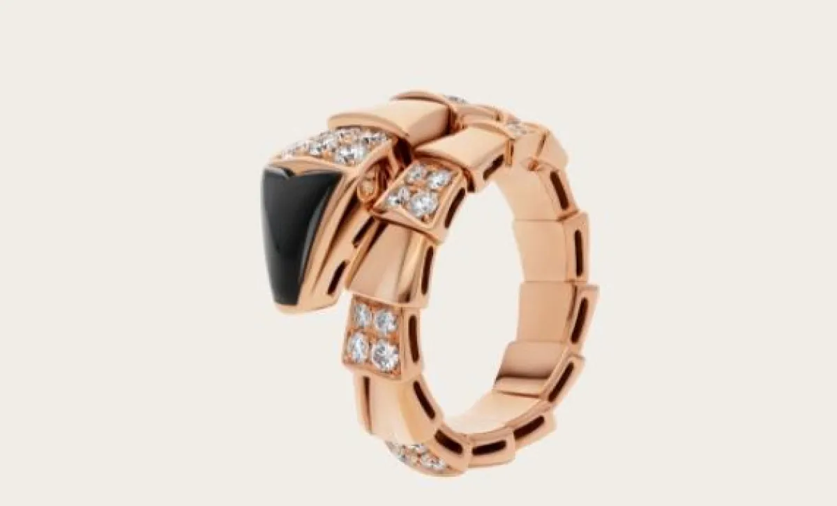 قدمت ماركة بولغري Bvlgari العديد من التصاميم الراقية والجذابة لخواتم مرصعة بالأحجار الكريمة، أعجبنا منها هذا التصميم الجذاب لخاتم Serpenti Viper ، الذي صُمم من الذهب الوردي عيار 18 قيراطًا، وجاء مرصعاً بحجر العقيق اليماني، والألماس بوزن 0.75 قيراطاً.