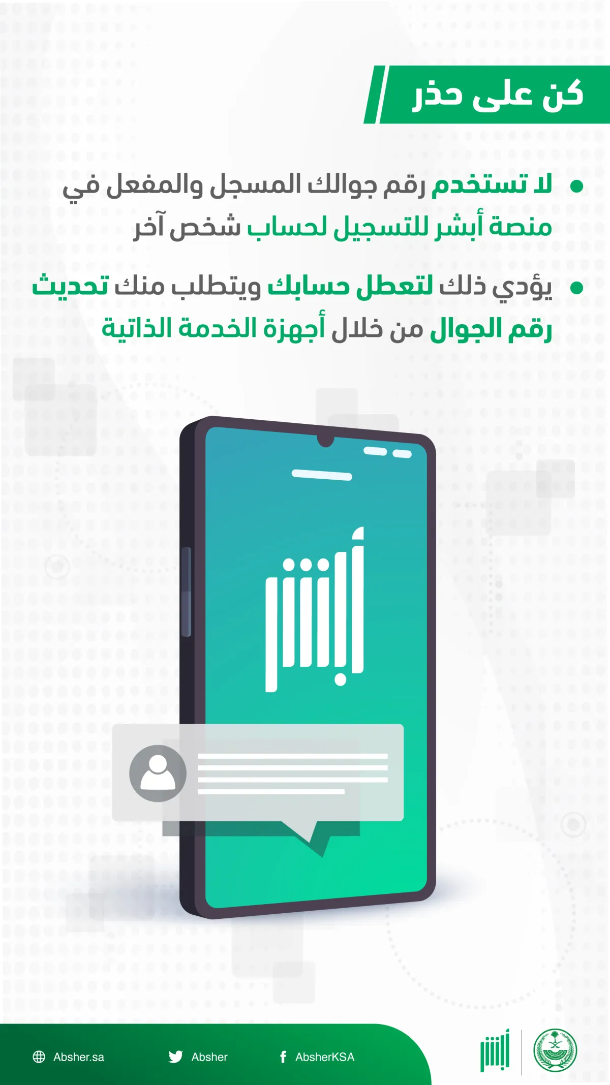 حذرت منصة "أبشر"، عبر حسابها بموقع التواصل الإجتماعي "تويتر" المستفيدين من خدماتها، من استخدام رقم الجوال المسجل في حساباتهم بمنصتها الإلكترونية للتسجيل في حساب شخص آخر.