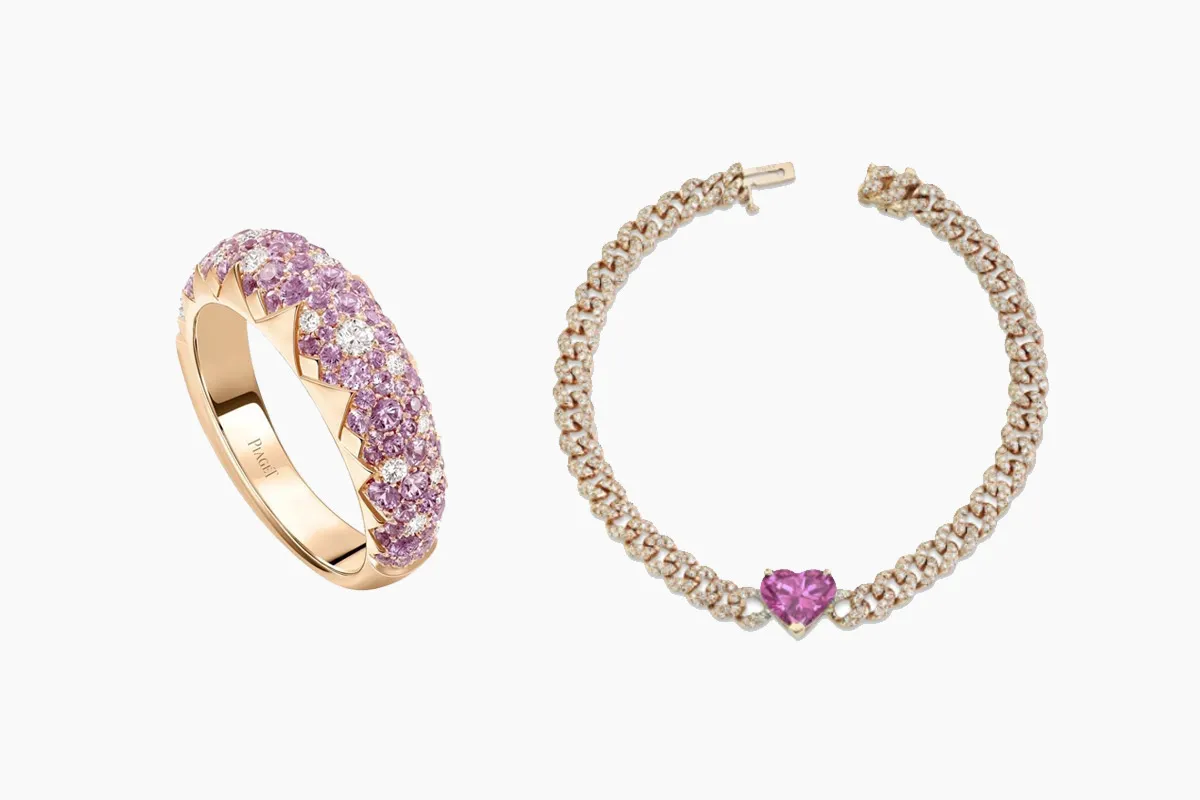 لإطلالة راقية وجذابة، قدمت ماركة بياجيه Piaget هذا التصميم لخاتم Piaget Sunlight المُصمم من الذهب الوردي عيار 18 قيراطاً، ومُرصعاً بالألماس الأبيض والياقوت البفنسجي.