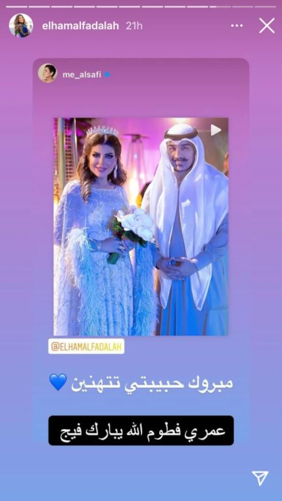 نشرت الفنانة الكويتية إلهام الفضالة على ستوري "إنستقرام" الخاص بها مجموعة من صور التهاني التي تلقتها من زملائها بالوسط الفني وتعليقها عليها، حيث كتب لها الفنان يعقوب عبد الله: "ألف مبروك والله يتمم عليكم بالخير"، وردت إلهام: "الله يبارك فيك يا أبو يوسف الغالي"، فيما كتبت الكاتبة مريم القلاف: "ألف مبروك إلهام وشهاب"، وردت إلهام: "الله يبارك فيك حبيبتي"، بينما كتب الفنان عبد المحسن النمر: "ألف مبروك لأخوي الغالي شهاب جوهر والفنانة العزيزة إلهام الفضالة على عقد القران الله يتمم عليكم ويسعدكم ويوفقكم"، وردت إلهام: "الله يبارك فيك".