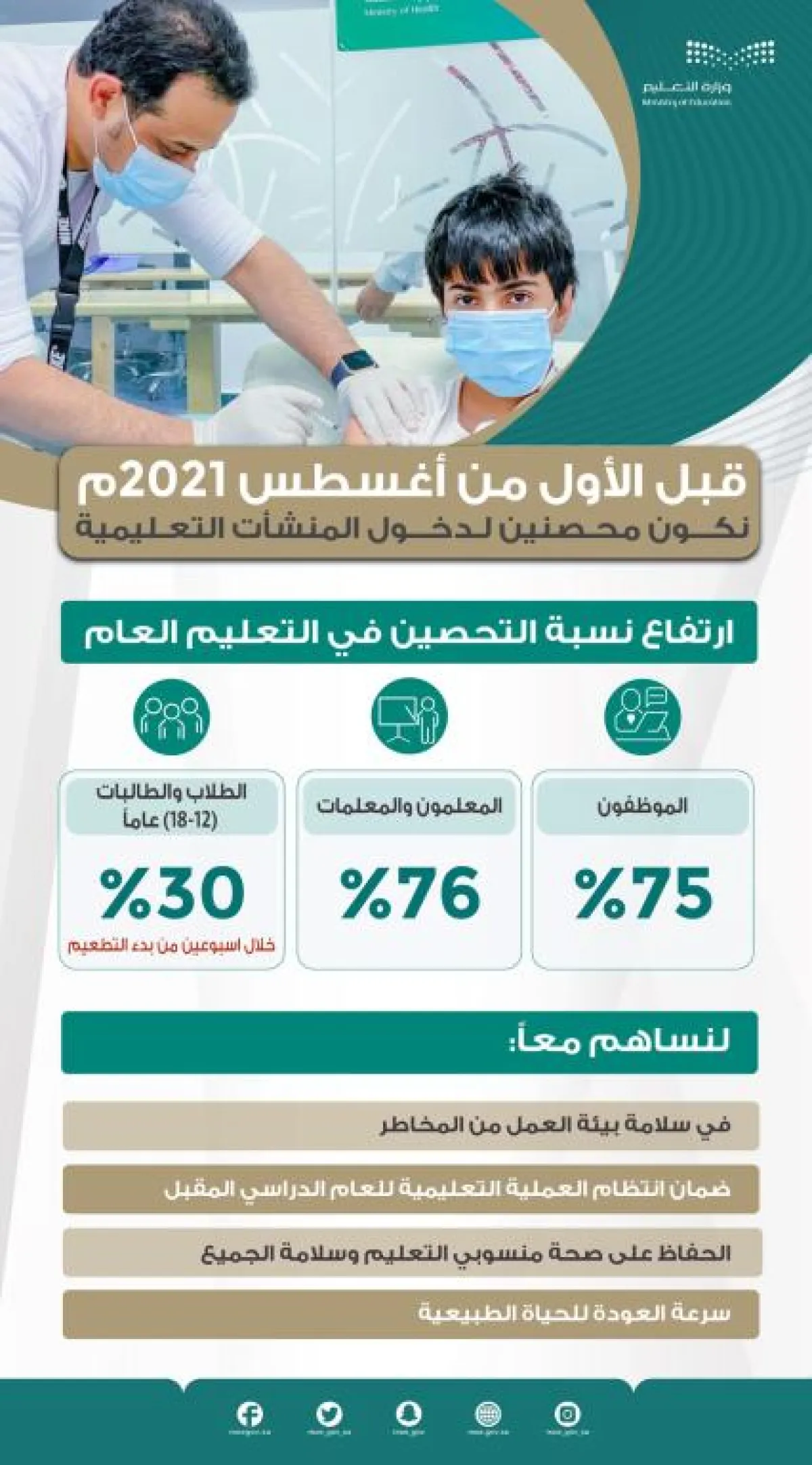 يشار إلى أن التعليم كانت قد نوهت بأن دخول مقر الوزارة والمنشآت التعليمية الحكومية والأهلية سيقتصر على المحصنين ضد كوفيد 19 اعتبارًا من 22 ذي الحجة 1442هـ الموافق الأول من أغسطس 2021م.