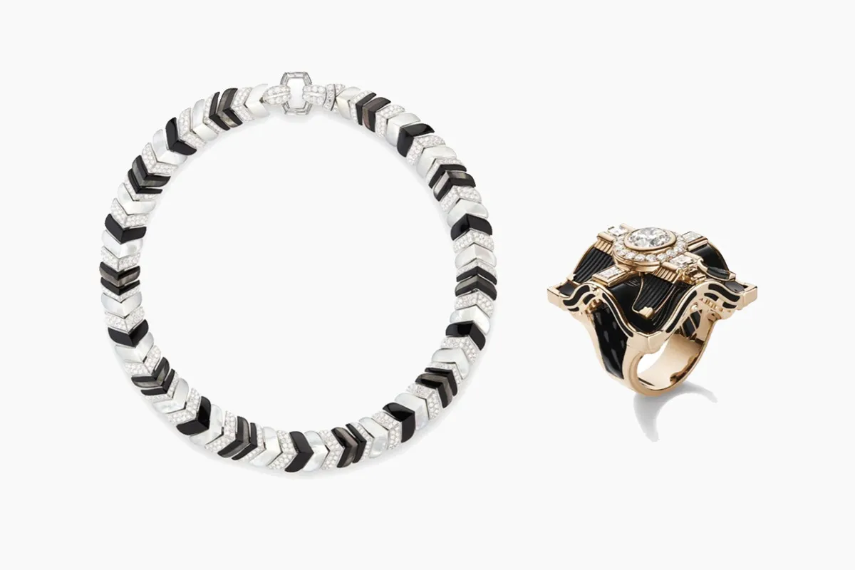 قدمت ماركة بوشرون Boucheron العديد من التصاميم الجذابة للقلادات المرصّعة بالأحجار الكريمة الملونة، وقد أعجبنا هذا التصميم لعقد يتميز بلمسة جديدة على شكل شيفرون وهى فكرة الفن الأرت ديكو المطلقة الذي يكسر إصدار الجزع وعرق اللؤلؤ الكلاسيكية لإطلالة جريئة وأنيقة.