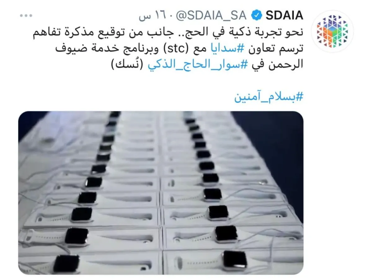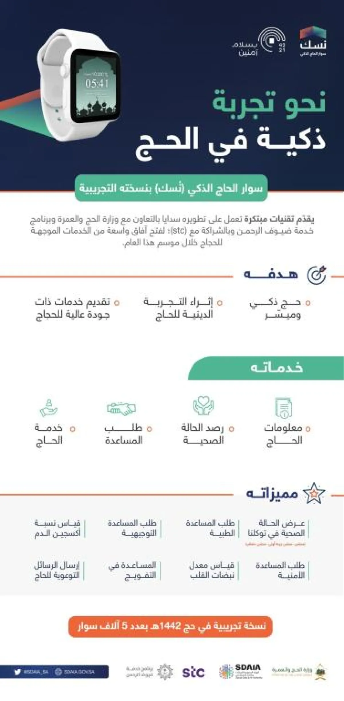 سوار الحاج الذكي "نسك" بنسخته التجريبة يقدم تقنيات مبتكرة تعمل على تطويره "سدايا" بالتعاون مع وزارة الحج و العمرة وبرنامج خدمة ضيوف الرحمن وبالشراكة مع stc لفتح آفاق واسعة من الخدمات الموجهة للحجاج خلال موسم هذا العام.