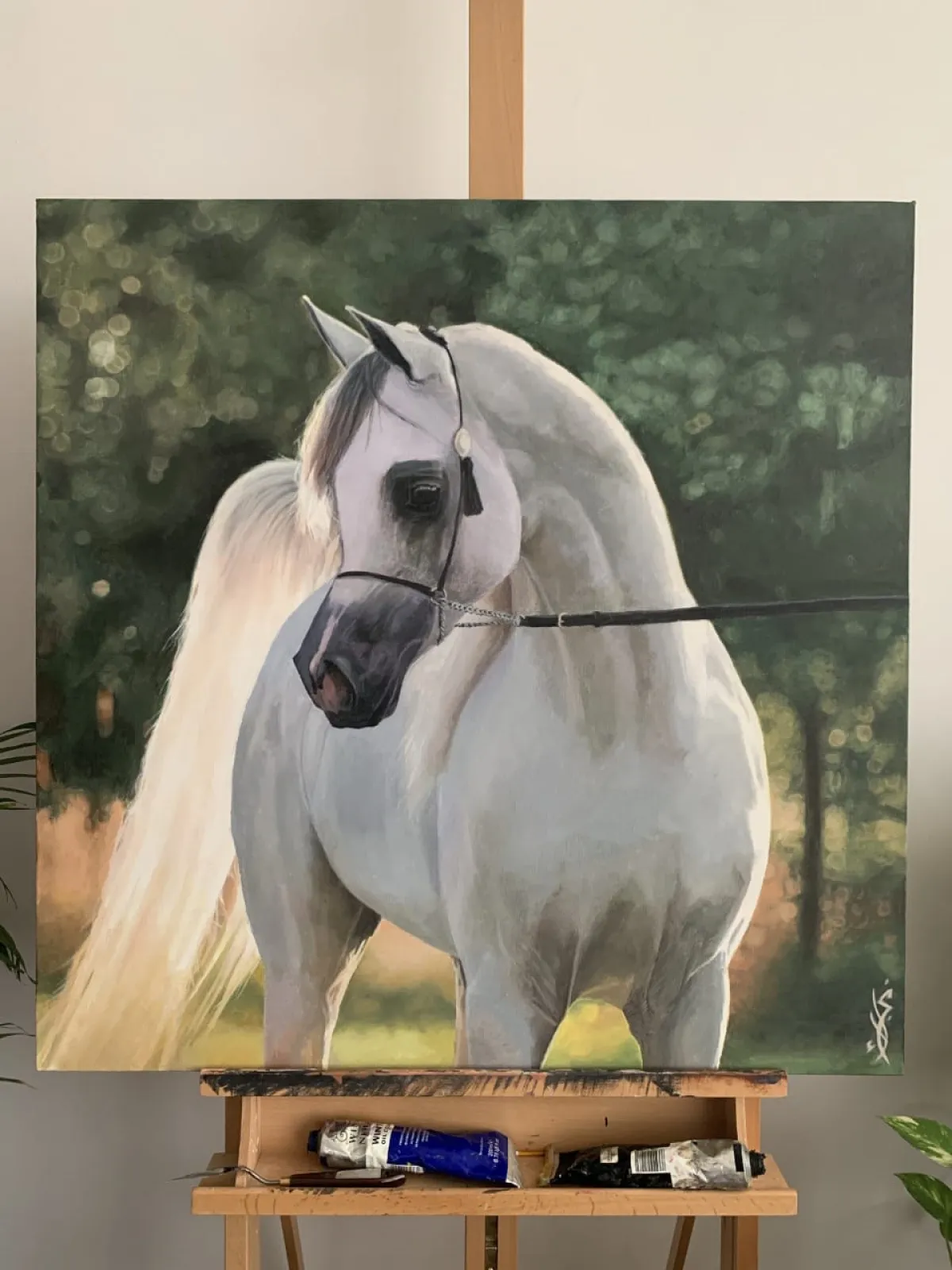 لوحة للخيل العربي الأولى كانت أول مره أرسم فيها خيل واقعي ومن بعدها استمريت وتجرأت للرسم أكثر بكثير