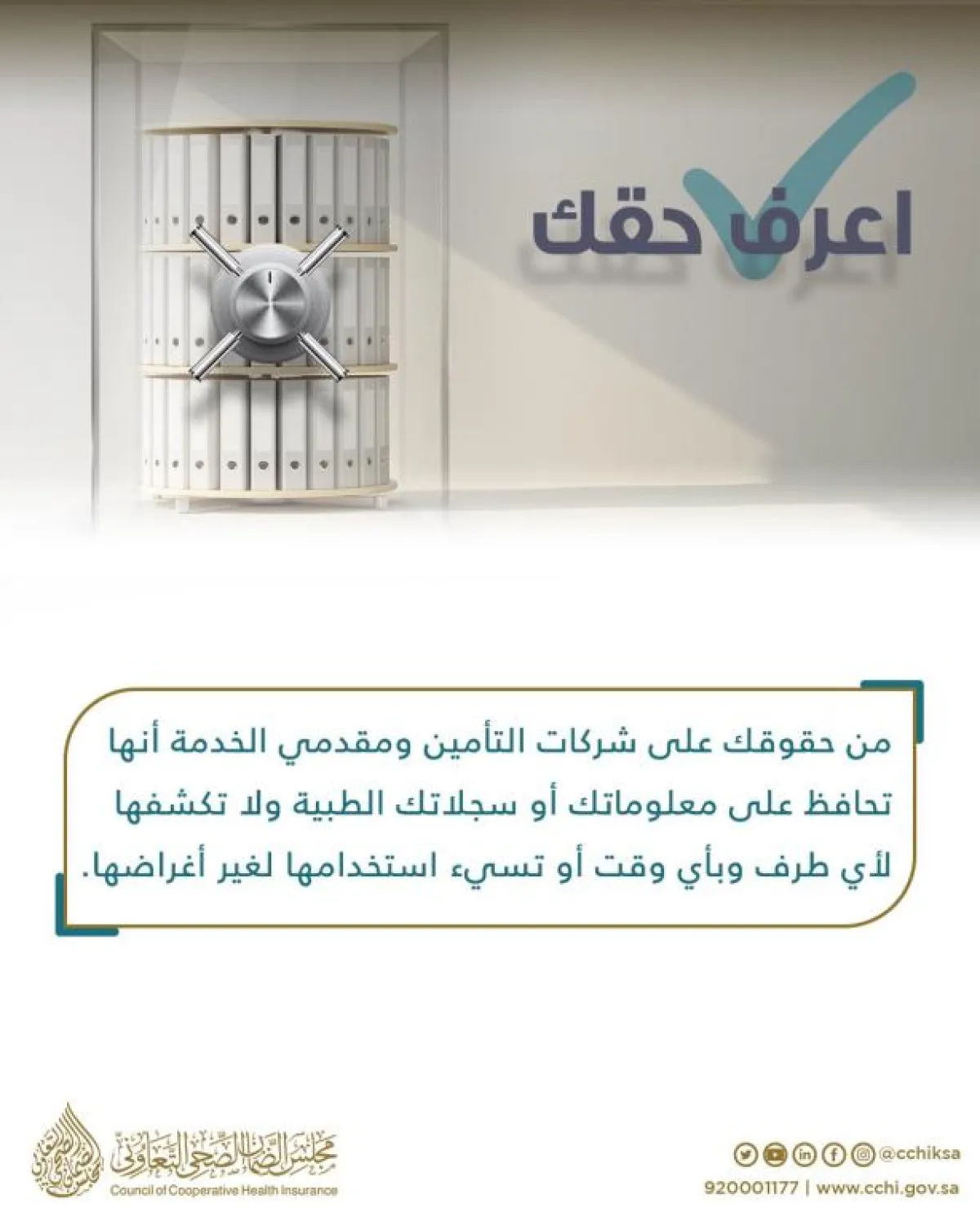 • من حقوقك على شركات التأمين ومقدمي الخدمة أنها تحافظ على معلوماتك أو سجلاتك الطبية ولا تكشفها لأي طرف وبأي وقت، أو تسئ استخدامها لغير أغراضها.