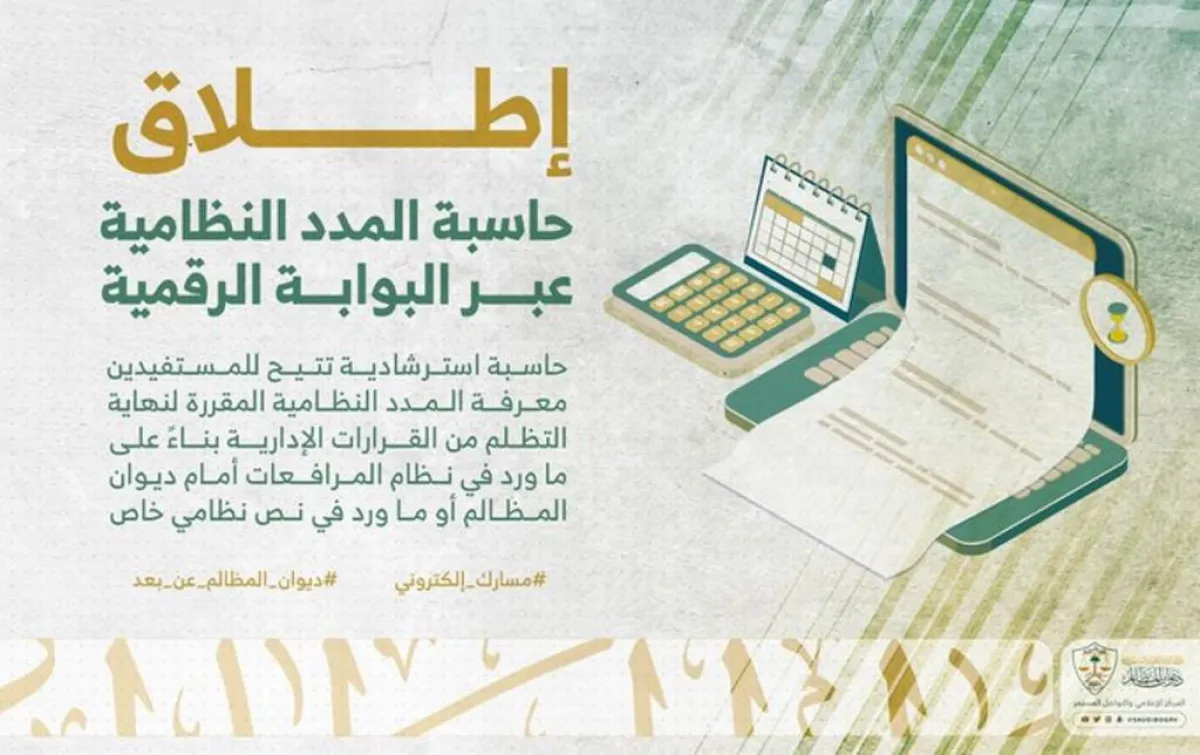 أعلن ديوان المظالم إطلاق خدمة حاسبة المدد النظامية، التي تتيح معرفة المدد النظامية المقررة لنهاية التظلم من القرارات الإدارية، بناءً على ما ورد في نظام المرافعات أمام ديوان المظالم أو ما ورد في نص نظامي خاص، وذلك بحسب المدخلات من المستفيد.
