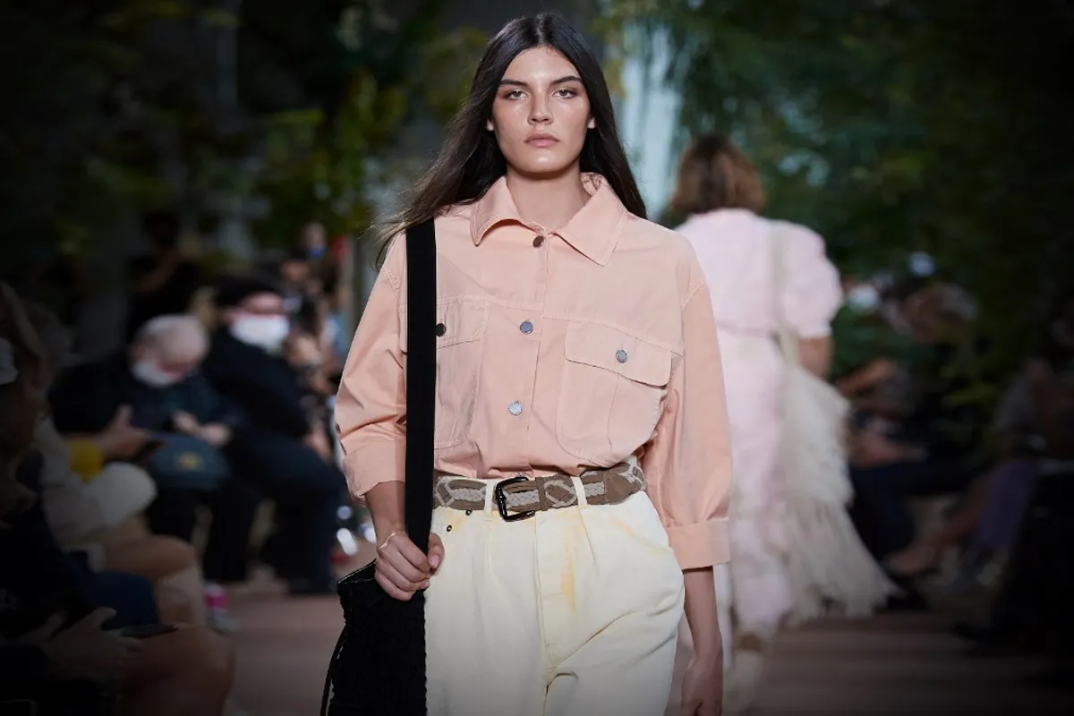 لإطلالة أكثر عصرية وجاذبية مناسبة لإطلالاتك النهارية العملية، قدمت علامة Alberta ferretti تصاميم متنوعة بألوان الباستيل، وقد أعجبنا منها هذا القميص المصمم باللون الوردي الباستيل بأكمام طويلة وواسعة وبياقة عريضة مع جيوب أمامية كبيرة وأزرار للإغلاق على الجيوب مع ثلاثة أزرار في منتصف القميص ويُمكنك تنسيق هذا القميص مع سروال واسع باللون الأبيض وحزام جذاب باللون البُني الفاتح، ولكي تُبرزي هذا الطقم يُمكنك تنسيق حقيبة كتف باللون الأسود من القماش وصندل مفتوح بدون كعب باللون الأوف وايت .