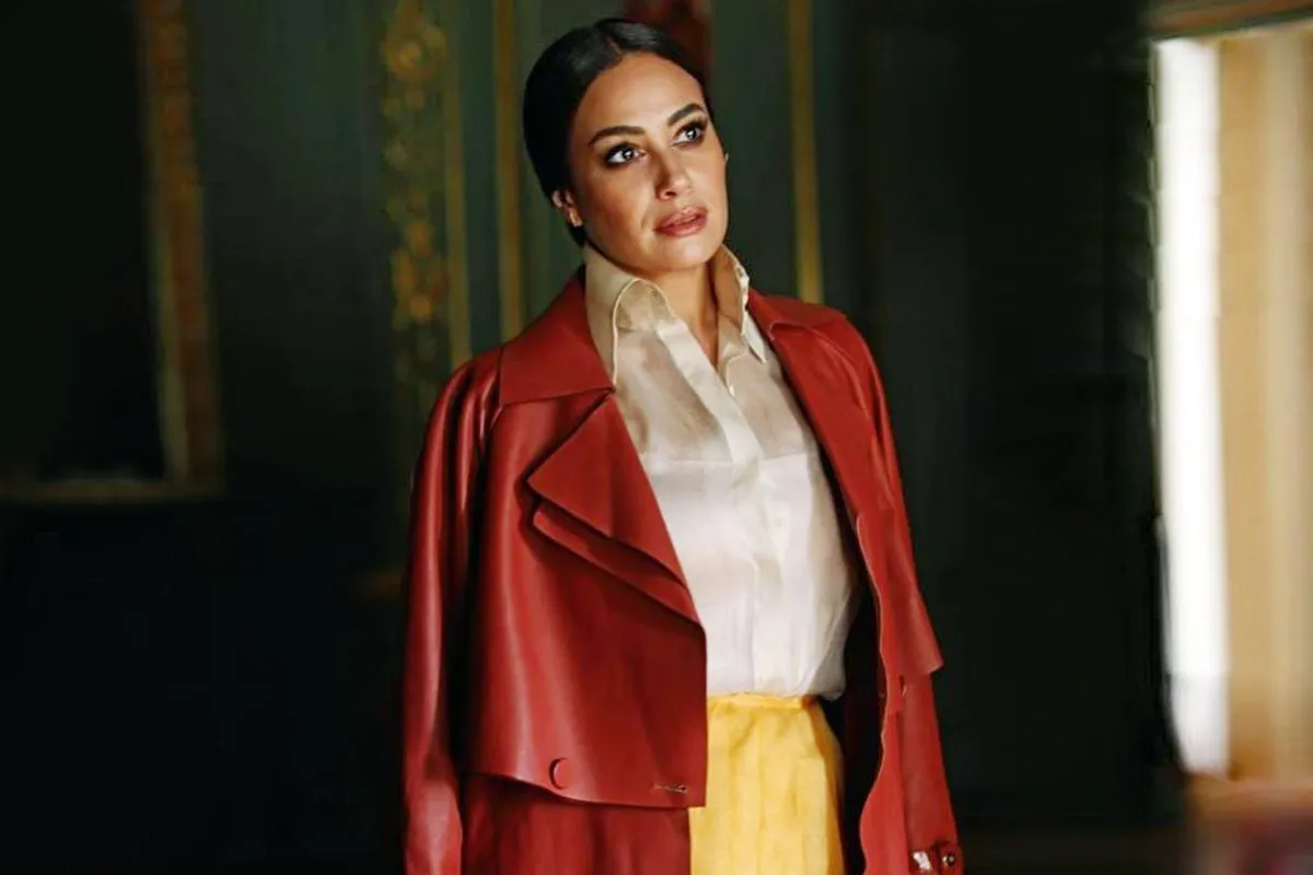 هند صبري بجاكيت جلد طويل كلاسيكي
