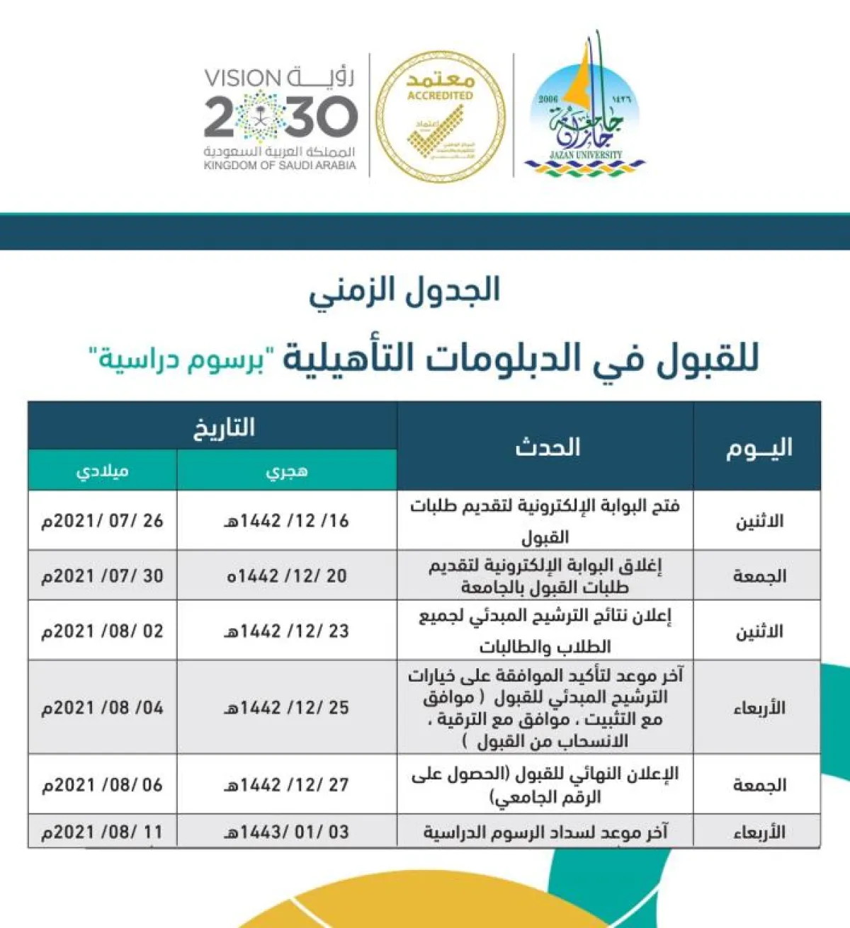 بدأت جامعة جازان ممثلة بعمادة خدمة المجتمع والتعليم المستمر اليوم، استقبال طلبات الراغبين في التسجيل بالدبلومات التأهيلية المدفوعة، عبر البوابة الإلكترونية للجامعة.