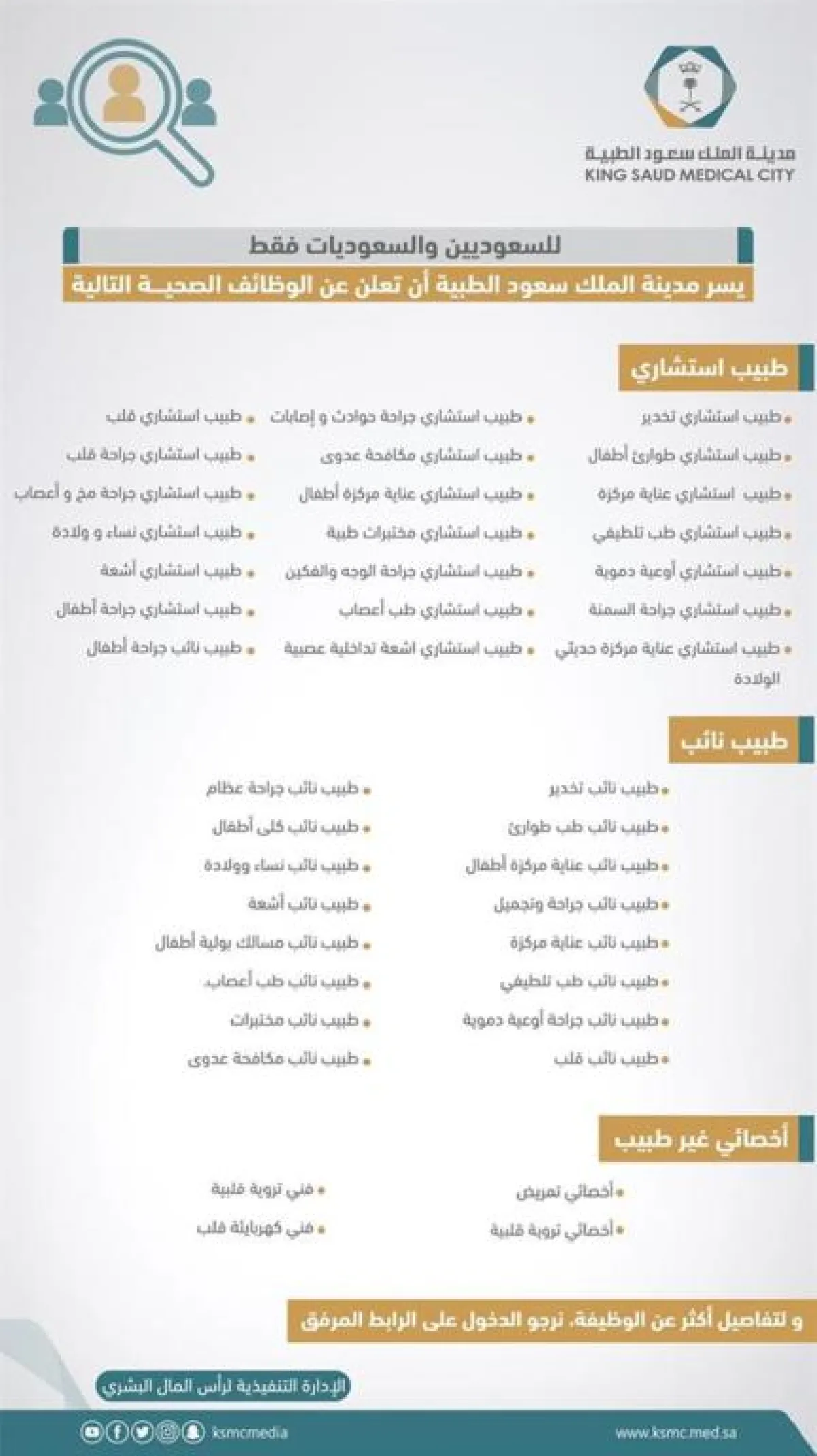 وكشفت المدينة عن حاجتها لأطباء استشاريين في تخصصات مختلفة، وكذلك وظيفة طبيب نائب، وأخصائي غير طبيب في التمريض والتروية القلبية، وفني "تروية قلبية وكهرباء قلب".