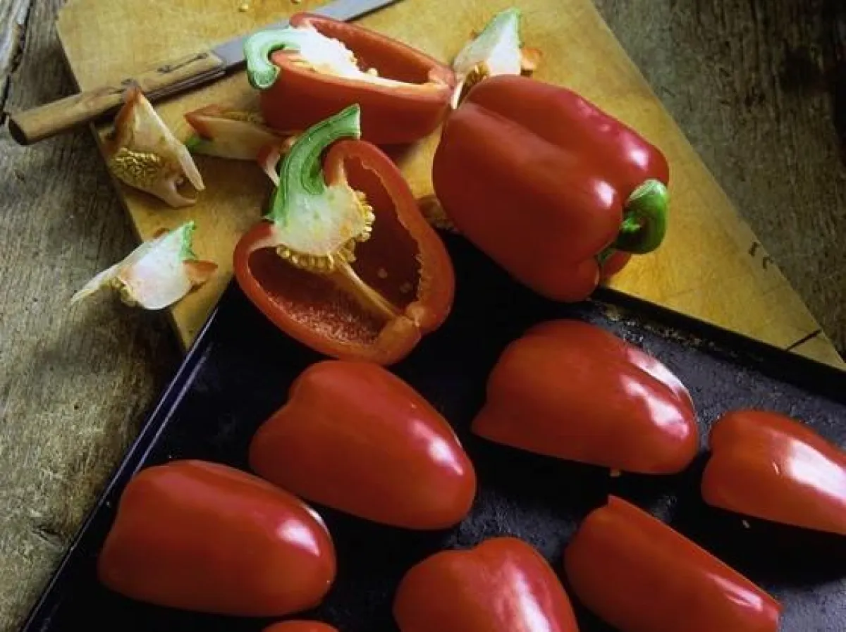 1- تُقطّع حبّة الفليفلة الحمراء إلى 4 قطع، وتنزع البذور من داخلها.