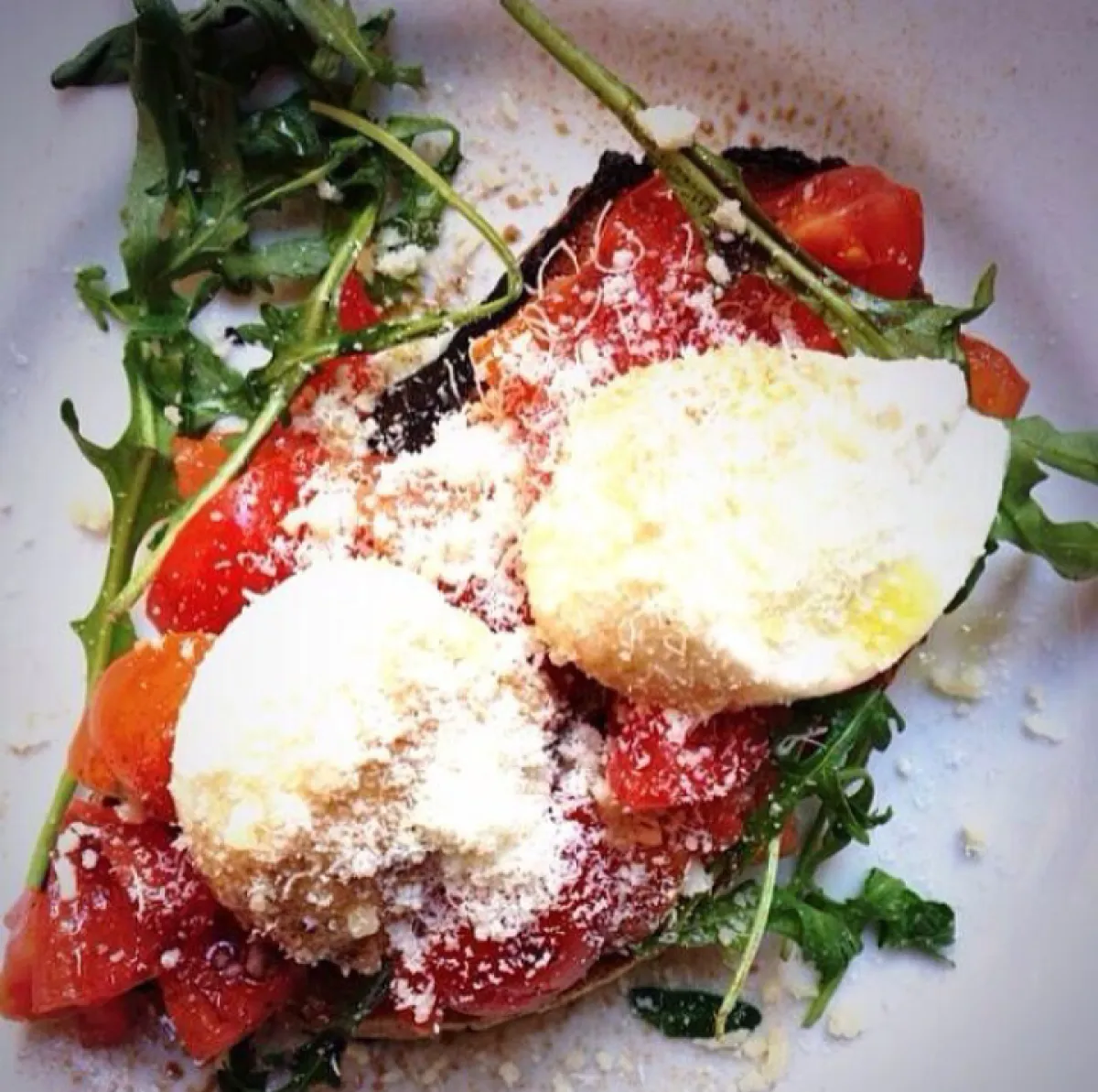 8- في طبق التقديم، توضع قطعة "التوست"، وتوزّع قطع الفليفلة الحمراء المشوية فوقها، تعلوها البندورة المشوية، فالبطاطس المقلية.ثم، ينثر جبن "البارميزان"، ويزيّن بأوراق الخسّ، ويقدّم على الفور.