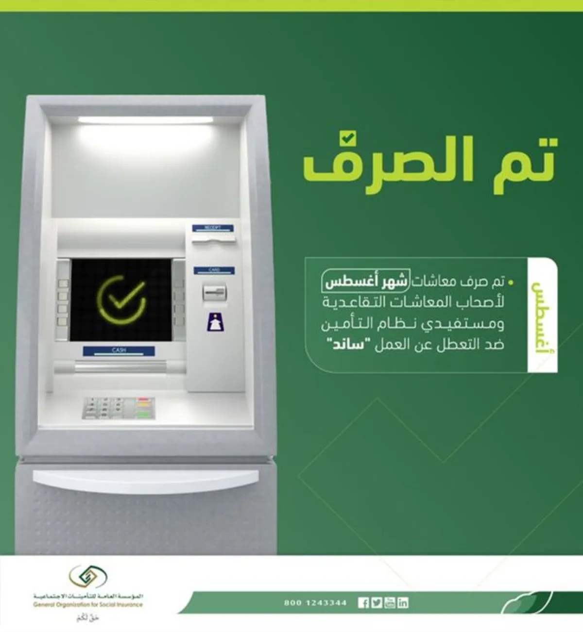 أعلنت المؤسسة العامة للتأمينات الاجتماعية عبر حسابها الرسمي على موقع التدوينات المصغر "تويتر" عن صرف معاش شهر أغسطس الجاري، لأصحاب المعاشات التقاعدية، ومستفيدي نظام التأمين ضد التعطل عن العمل "ساند".