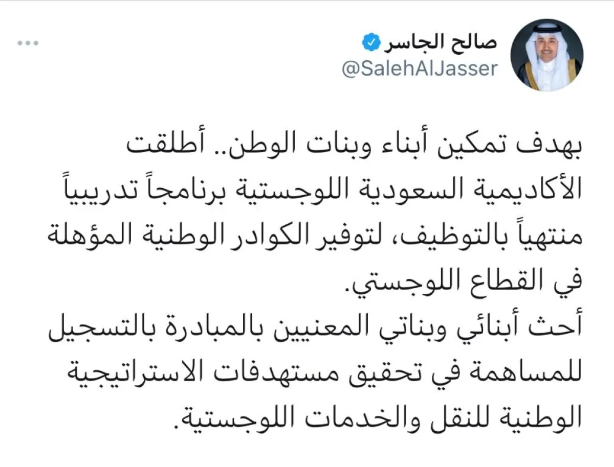 وقال: بهدف تمكين أبناء وبنات الوطن.. أطلقت الأكاديمية السعودية اللوجستية برنامجًا تدريبيًا منتهيًا بالتوظيف، لتوفير الكوادر الوطنية المؤهلة في القطاع اللوجستي. أحث أبنائي وبناتي المعنيين بالمبادرة بالتسجيل للمساهمة في تحقيق مستهدفات الاستراتيجية الوطنية للنقل والخدمات اللوجستية.