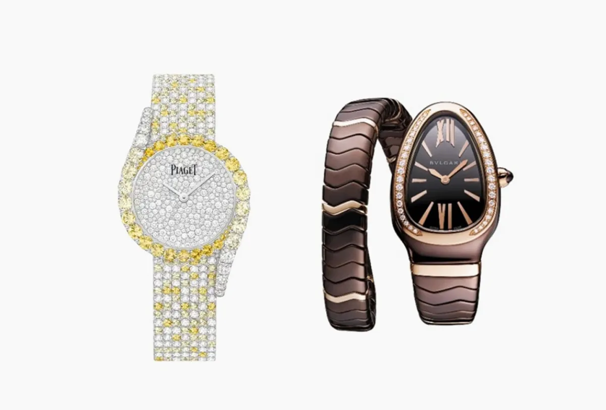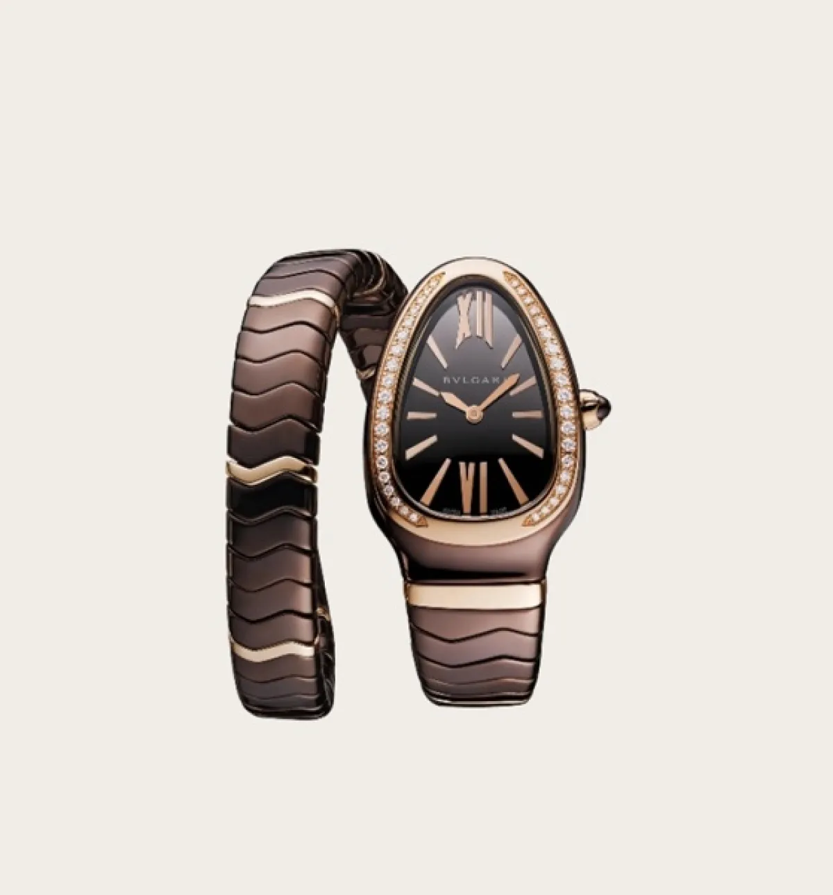قدمت ماركة بولغري Bvlgari موديلات عديدة للساعات الفاخرة وقد أعجبتنا هذه الساعة المصممة بعلبة منحنية من الذهب الوردي عيار ١٨ قيراطاً مرصع بالألماس وتاج من الذهب الوردي مرصع بعنصر السيراميك مع فصوص الماس المستديرة وجاء سوار الساعة بالسيراميك البُني وعناصر الذهب الوردي، وتتميز هذه الساعة الشبيهة بالجواهر بقدراتها على تشكيل مواد غير تقليدية مع رمز الماركة المحفور بأسلوب بارز على وجه الساعة الزجاجي .