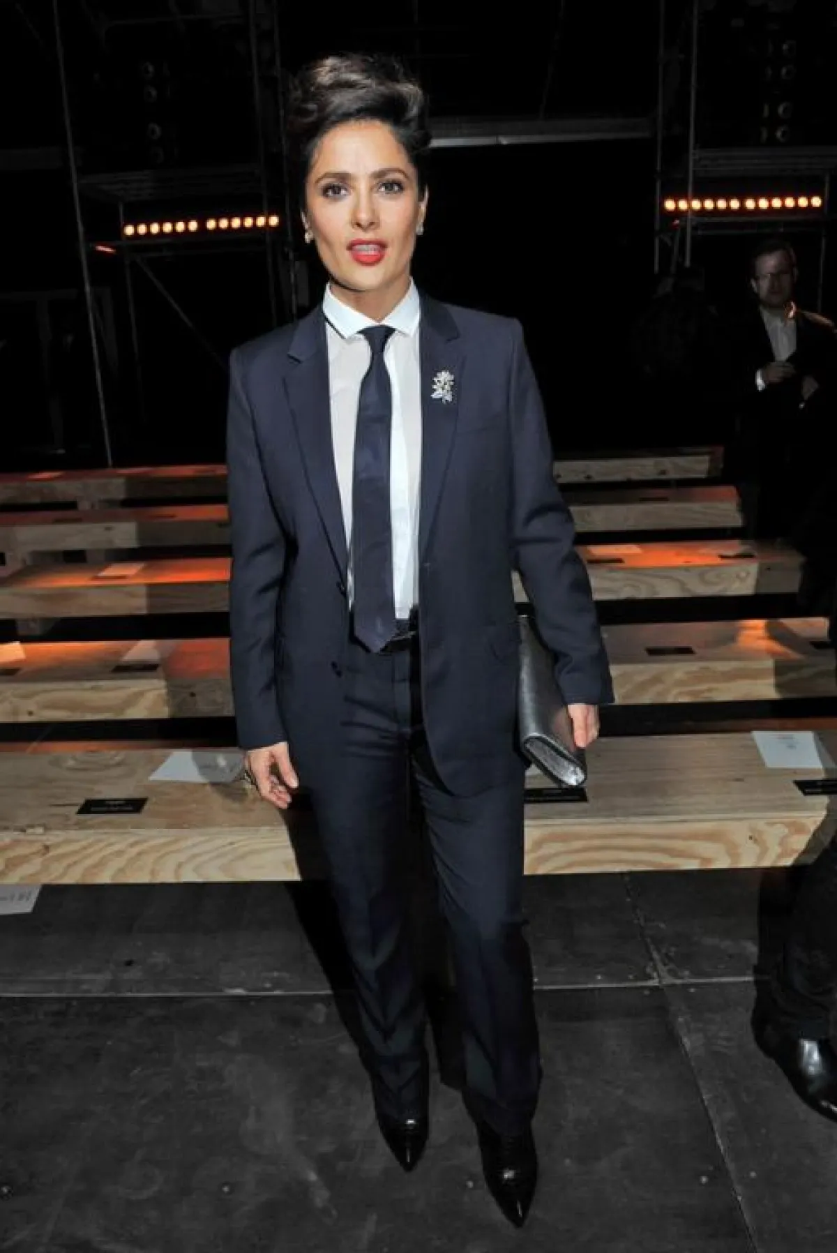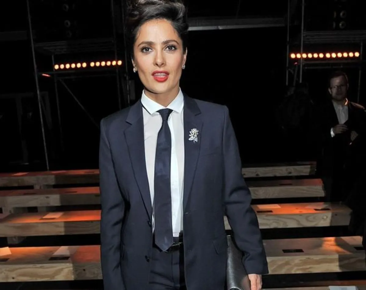 تقمصت الممثلة الجميلة Salma Hayek شخصية رجل أنيق لتحضر عرض Saint Laurent للأزياء الرجالية لموسم خريف وشتاء 2014 ، حيث اختارت النجمة أن تظهر بلوك رجالي وارتدت بدلة رسمية جميلة بلون كحلي داكن .