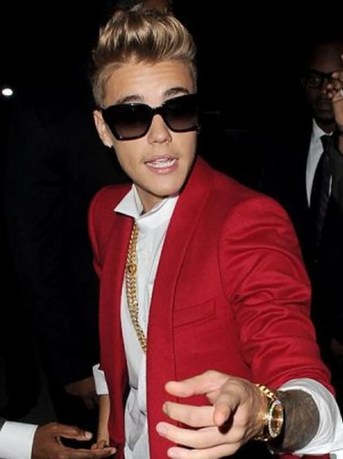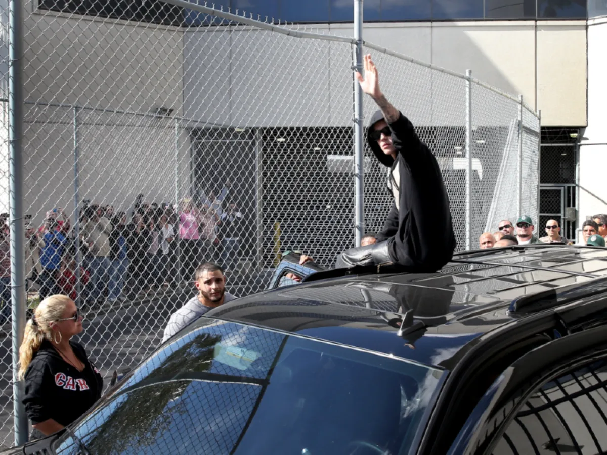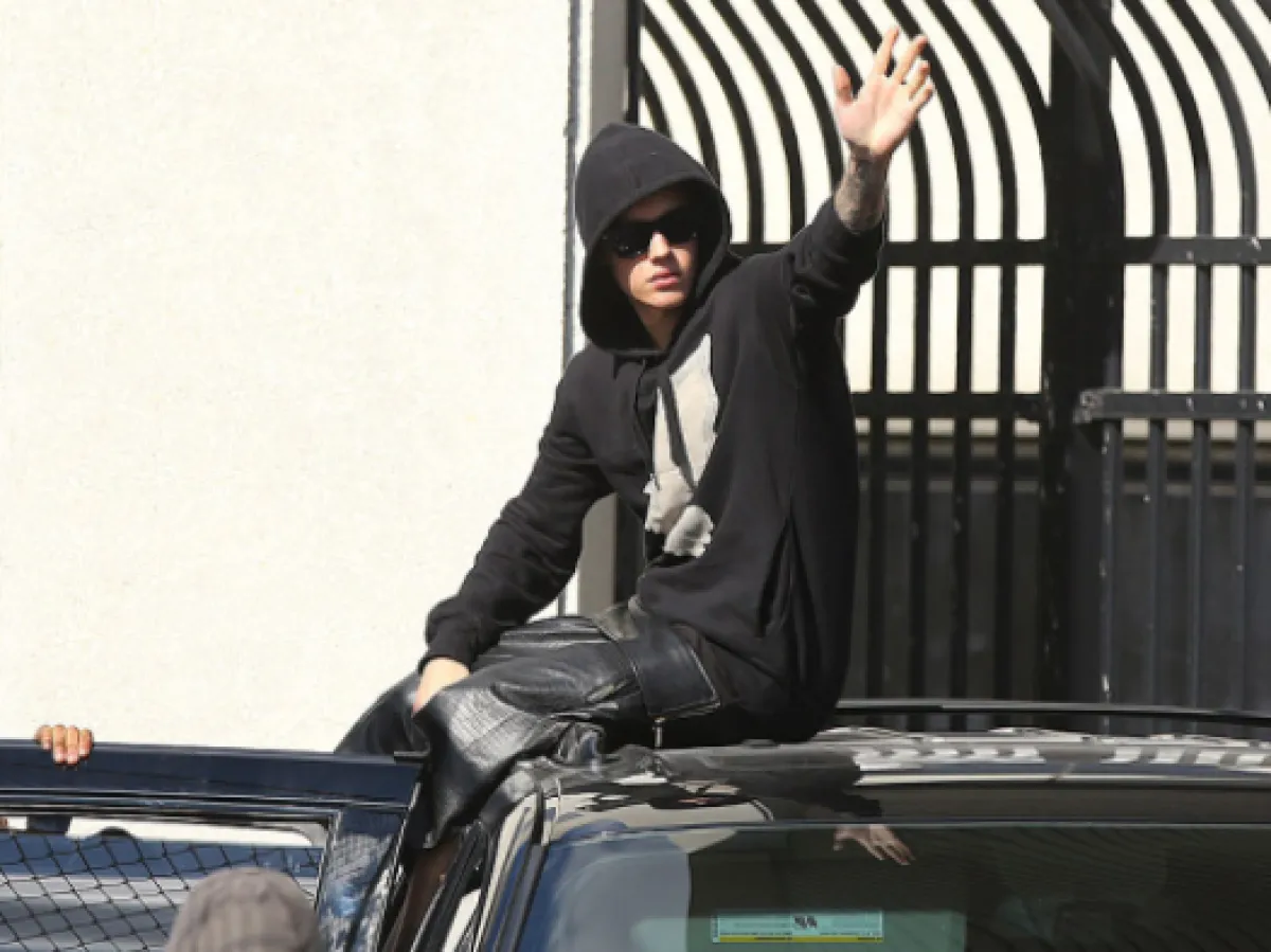 وخرج مغني البوب البالغ من العمر 19 عاماً بطريقة غير اعتيادية، إذ جلس على سطح سيارة رباعية الدفع SUV سوداء اللون، وهو يلوّح بيده لعدد كبير من المعجبين، كانوا ينتظرونه خارج مركز الشرطة دعماً له.