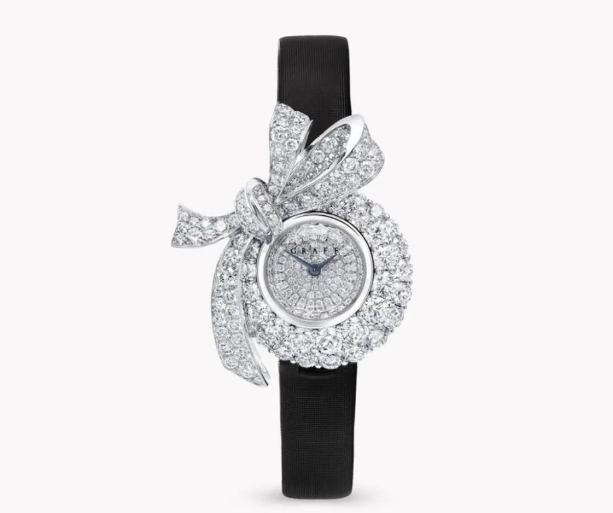 تُعتبر ساعة تيلدا الماسية Tilda's Bow Diamond Watch من علامة غراف Graff جوهرة رائعة تدل على الوقت بتصميمها الأنثوي والحساس، مقدَّمة على حزام من الساتان الأسود والمنحنيات المتألقة لشريط رُبط حديثاً، ويتميز الميناء برصفه بالألماس إلى جانب الذهب الأبيض، ويمكنك اعتماد مجوهرات أخرى من نفس المجموعة لأناقة فاخرة ومميزة، لكونها تشتمل على أقواس ألماسية متألقة مقدمة على قلادات صغيرة وأقراط مرصعة وخواتم ألماس دقيقة، جنباً إلى جنب مع تفسيرات معبرة عالية للمجوهرات التي تعرض شكل القوس الأيقوني الذي برز بشكل مميز عبر تاريخ العلامة.