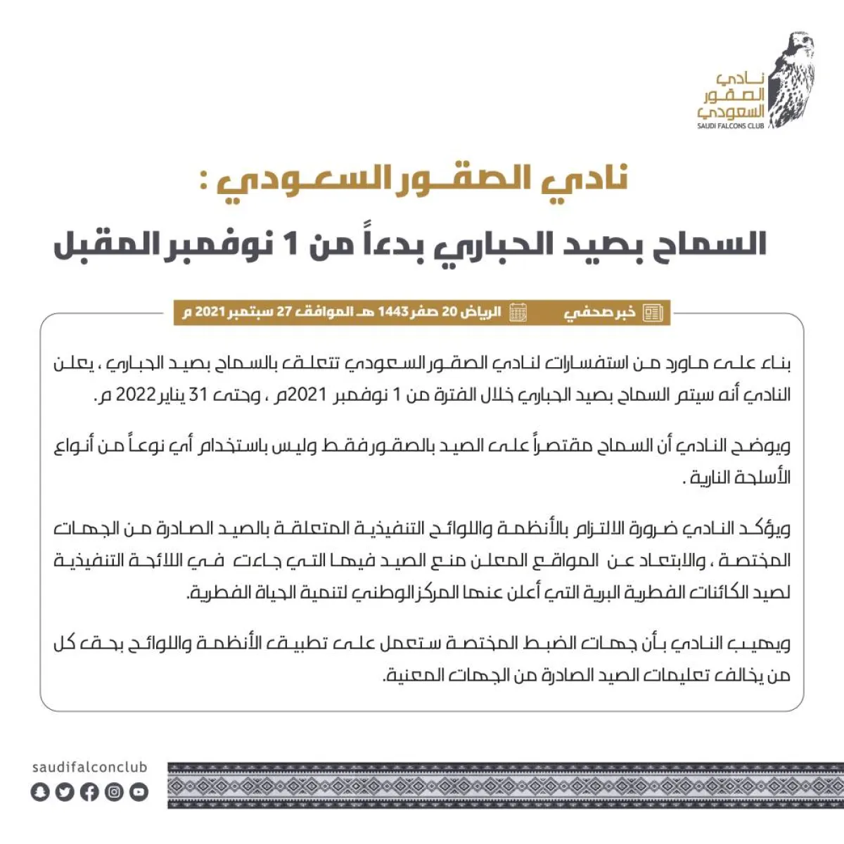 وقال النادي:" بناء على ماورد من استفسارات لنادي الصقور السعودي تتعلق بالسماح بصيد الحباري، يعلن النادي أنه سيتم السماح بصيد الحباري خلال الفترة من 1 نوفمبر 2021م، وحتى 31 يناير 2022م".