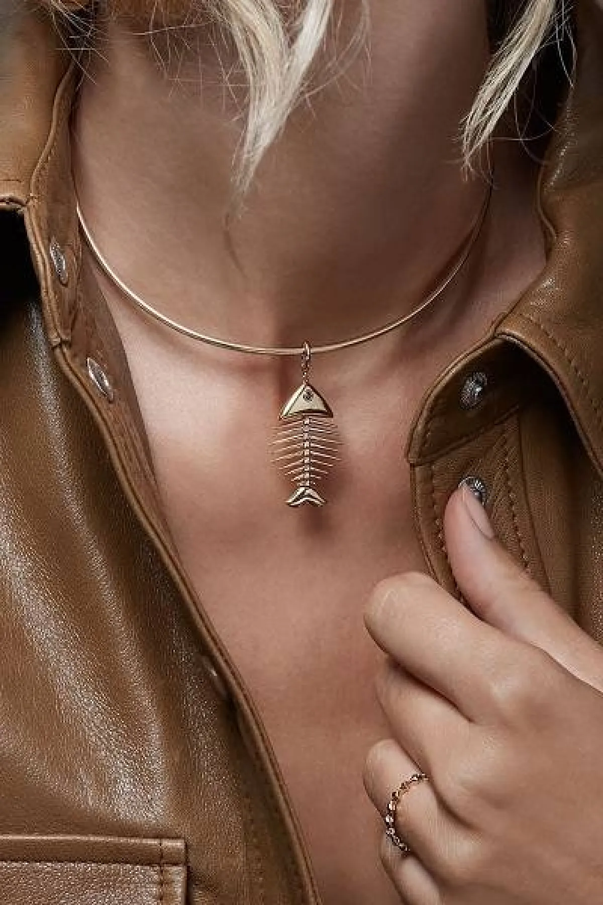 لتصميم أكثر عصرية، يجمع بين الأناقة والرقيّ، قدمت ماركة أنوشكا Annoushka عقد fish bones charm choker، الذي صُمم من الذهب الأصفر عيار 18 قيراطاً، يتدلي من مركزه هيكل عظمي لسمكة صغيرة، جاءت عظامها مُرصعة بالألماس، بتصميم عصري جذاب يخطف الأنظار.