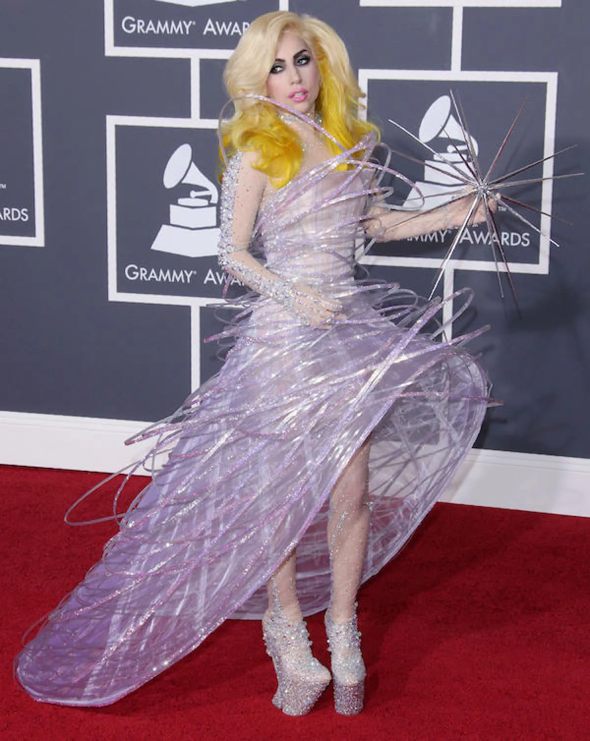عرفت النجمة Nicki Minaj بإطلالاتها المجنونة في حفلات "Grammys"، ومنها: إطلالتها في حفل عام 2012 برداء أحمر واسع من Versace، وتنافسها على لقب أكثر الإطلالات جنوناً Lady Gaga التي تتفنن باختيار أغرب الفساتين والإكسسوارات في كل حفل.