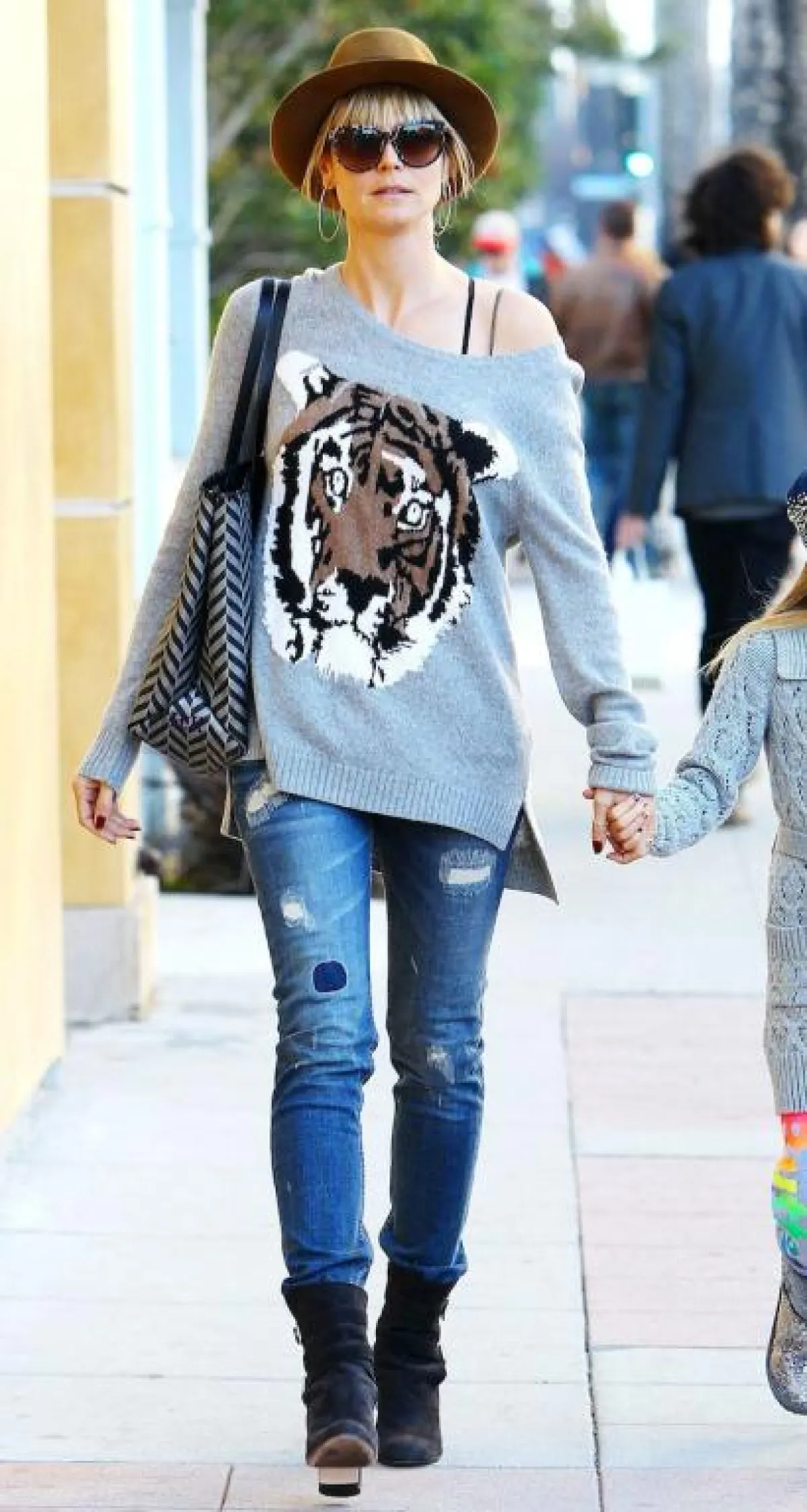 يبدو أن السترات الشتوية المزينة برسمة وجه النمر منتشرة بين النجمات في إطلالاتهن اليومية، حيث اختارتها عارضة الأزياء الألمانية Heidi Klum في إطلالة يومية بسيطة.