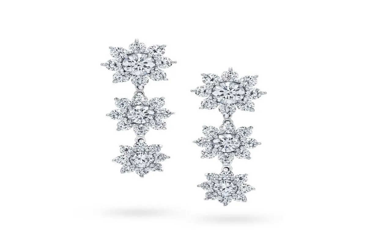 قدمت ماركة هاري وينستون Harry Winston العديد من التصاميم الفخمة لأقراط ألماس راقية تناسب عروس شتاء 2022، أعجبنا منها هذا التصميم لأقراط Sunflower ، التي صُممت من البلاتين، على شكل 3 ورود صغيرة في كل قرط، جاءت مُرصعة بـ54 ماسة مستديرة تزن ما يقرب من 1.98 قيراط.