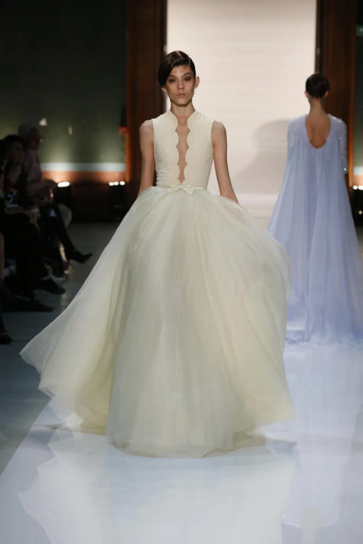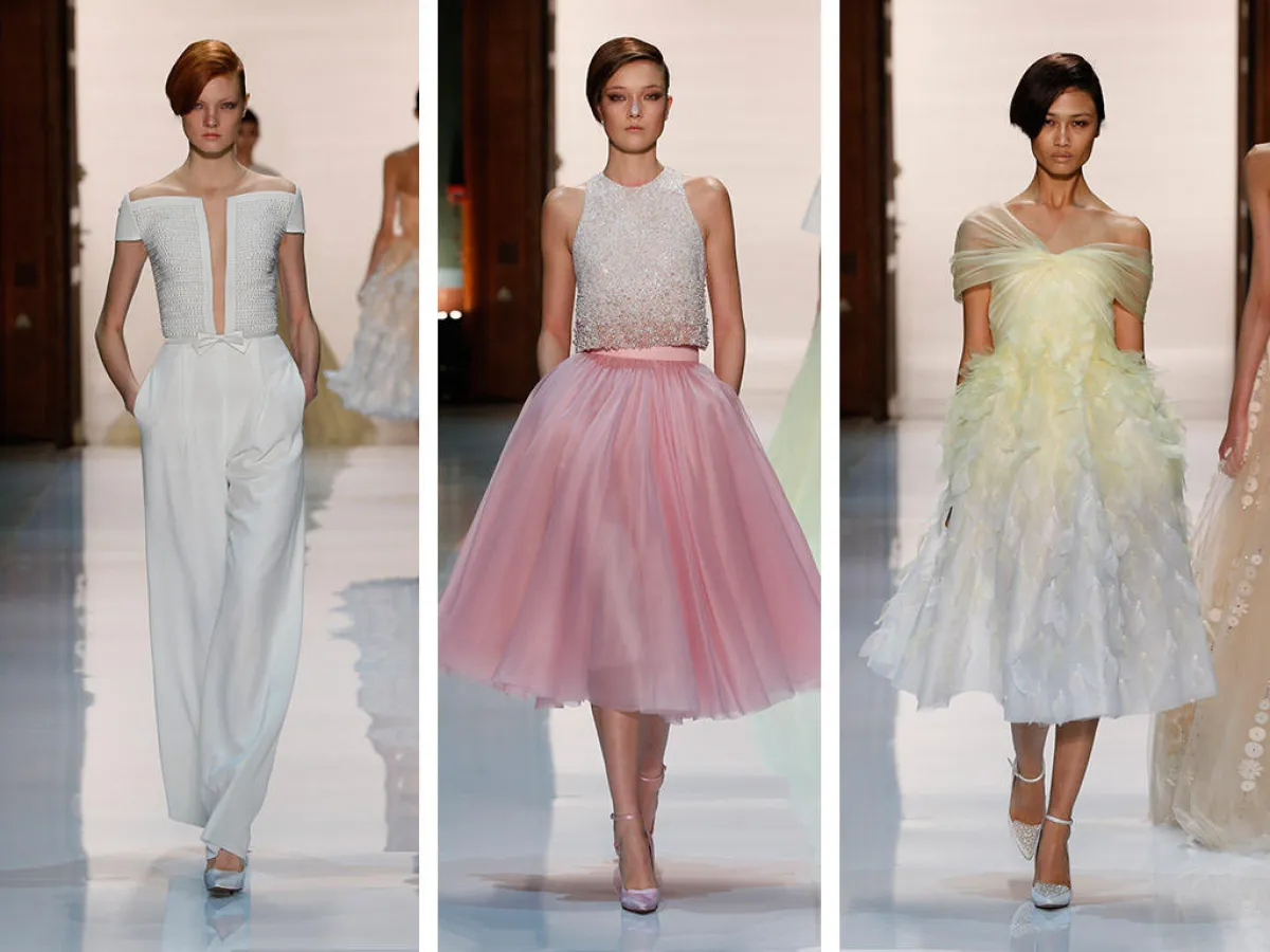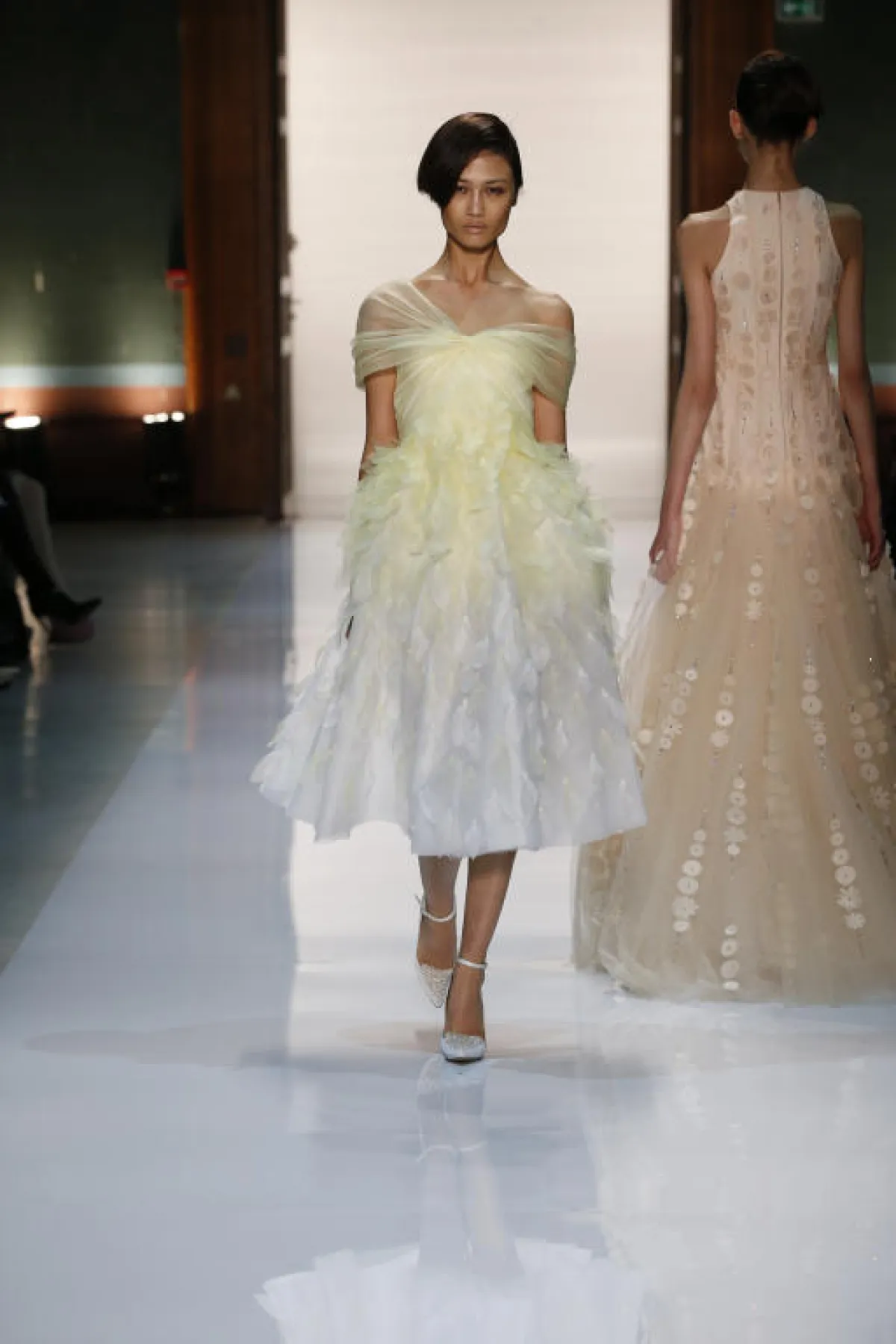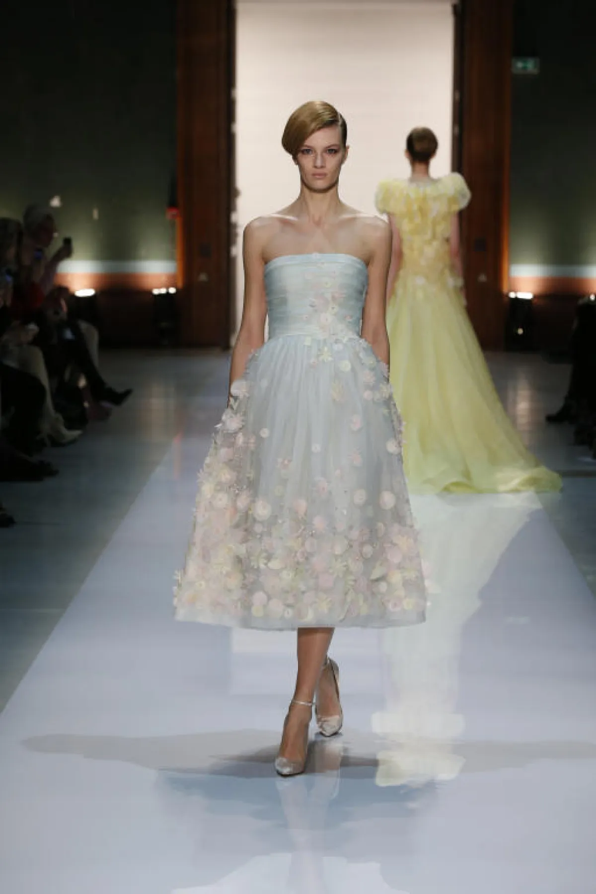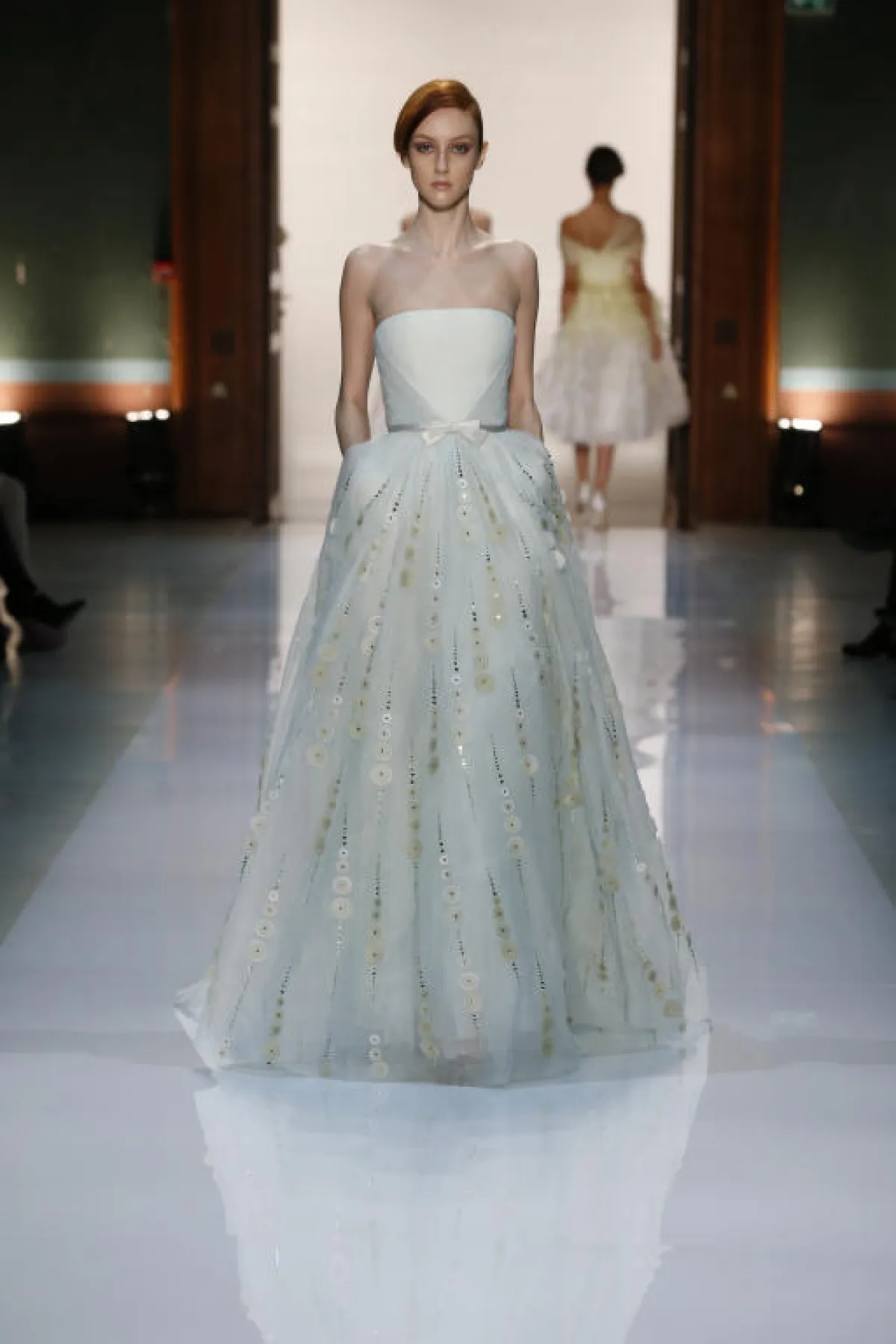 وبحرفية عالية، طُرّزت أوراق الأورغانزا على أقمشة الدانتيل، التي ارتدت بدورها ألوان الباستيل المذهلة والتي تليق بالموسم القادم.