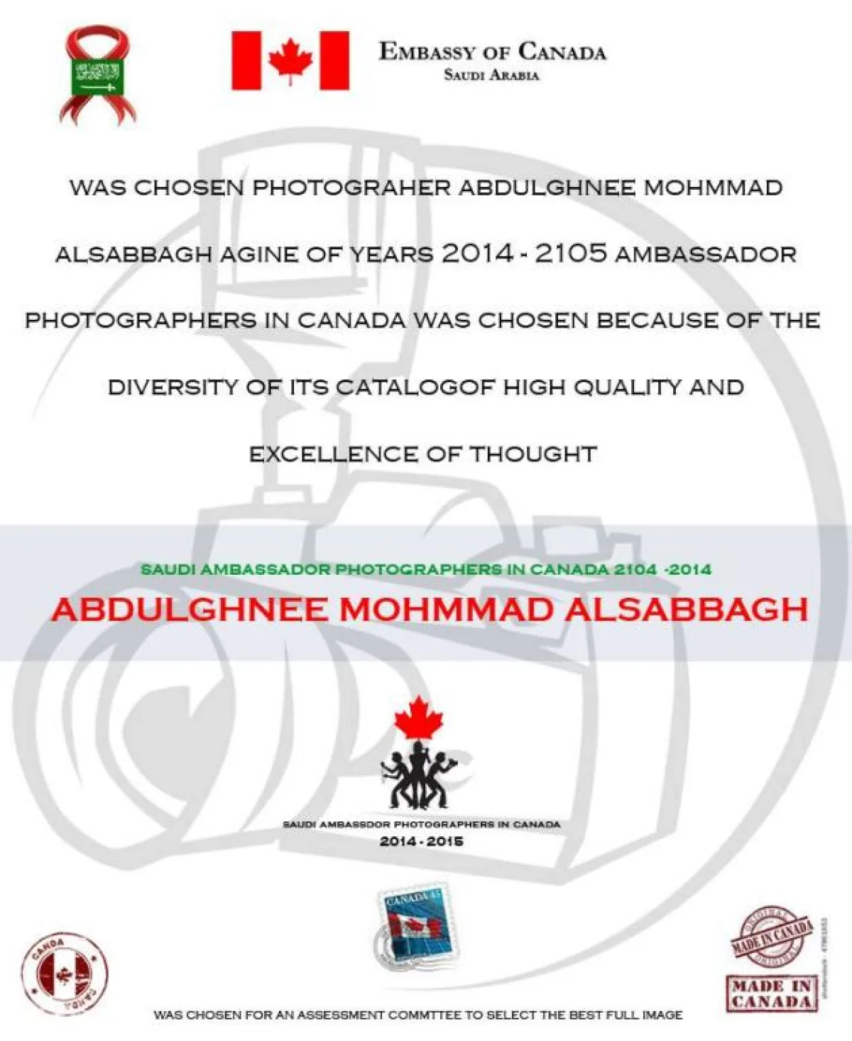 للمرة الثانية علي التوالي يعين عبد الغني الصباغ سفير المصورين العرب لعام 2014 – 2015م، مما دفع الصباغ لشكر كل من دعمه قائلا: لولا الله ثم انتم أنا لا شيء. شكراً لكم، وأتمنى أن أكون قدمت وما زلت أقدم صورة راقية بعدستي المتواضعة لكم ولبلدي وللعالمية. وأبان الصباغ أنَّ نسبة عدد الأصوات - السعودية 53% - المغرب 20 % - الإمارات 10% - مصر 9% - لبنان 8%.