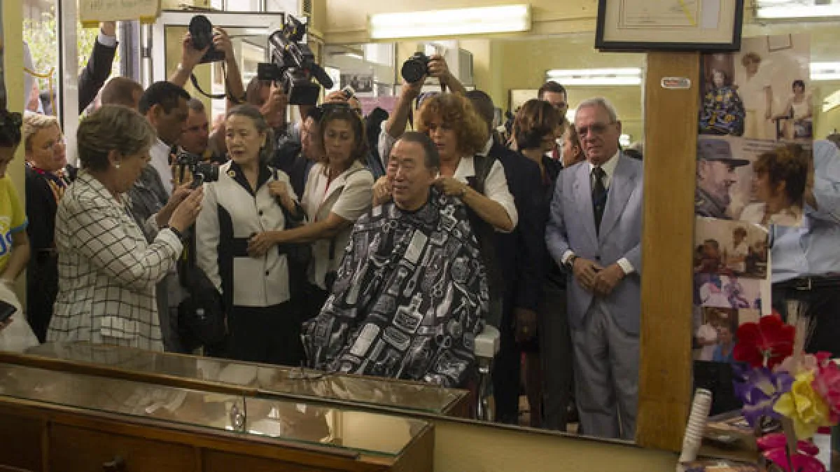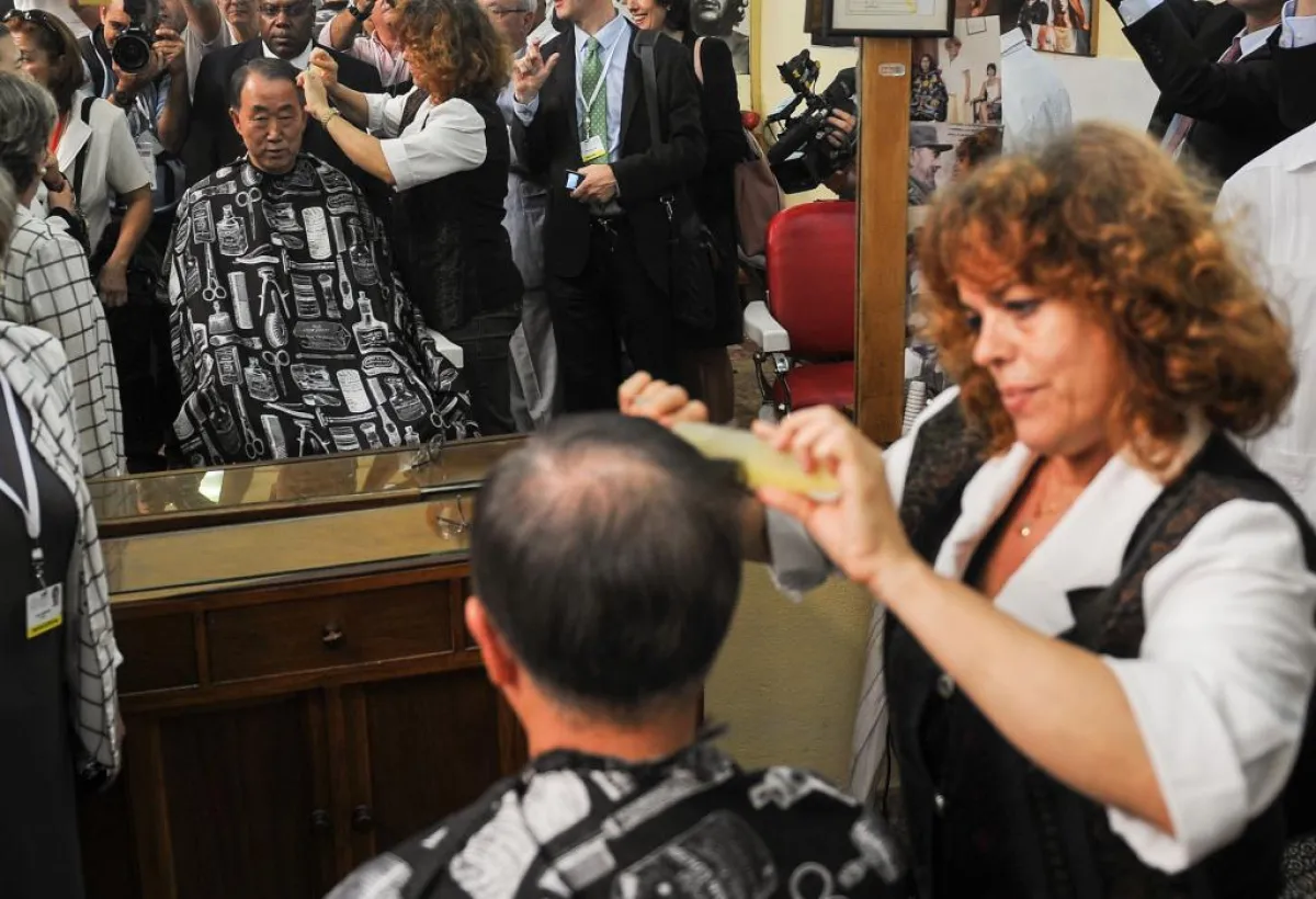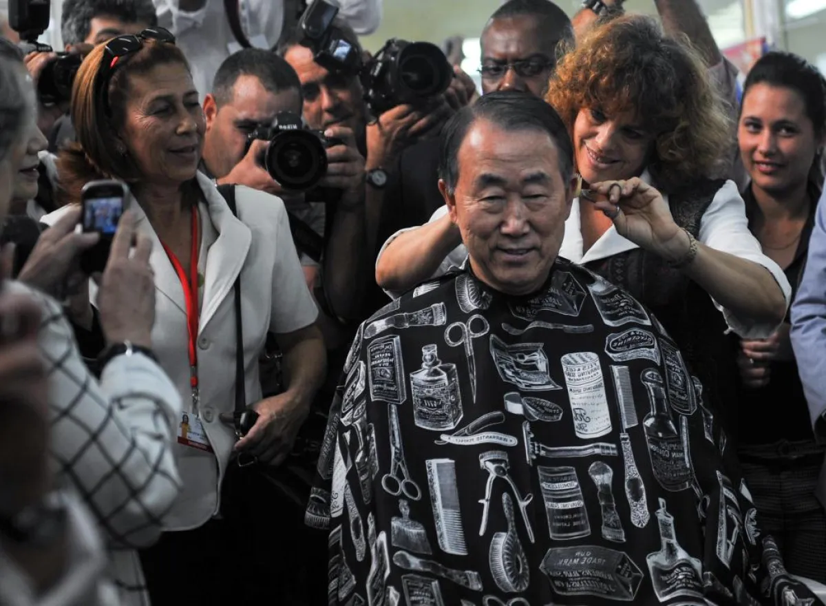 في ظلّ انشغال العالم بمؤتمر جينف الذي عقد تحت إشراف الأمين العام للأمم المتحدة Ban Ki-moon، استقطب الأمين العام الأضواء أثناء وجوده في أحد صالونات الحلاقة بهافانا في كوبا، وهو يقصّ شعره عند امرأة، ومن حوله الكثير من النساء.