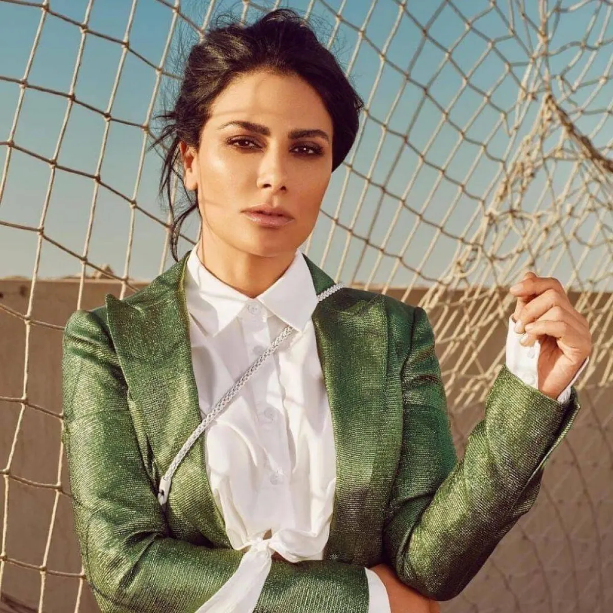 اختارت النجمة صبا مبارك في هذه الإطلالة بليزر جذاباً باللون الأخضر اللامع، وجاء بياقة طويلة وعريضة مع أزرار صغيرة مزيّنة بالأكمام باللون الأخضر وجيوب أمامية، ونسقت معه قميصاً أنيقاً باللون الأبيض، ويسندل منه قطعة قماش طويلة على شكل فيونكة .