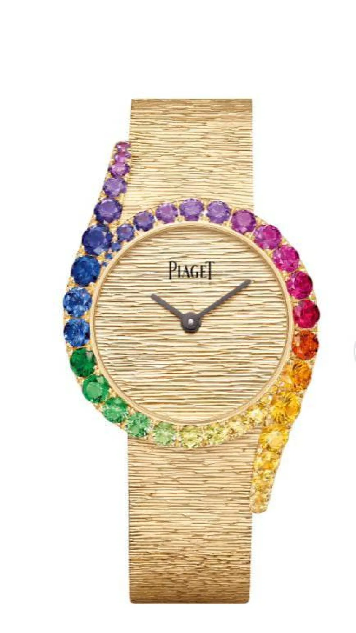 اعتمدي هذه الساعة الفخمة من علامة بياجيه Piaget المصممة من بعلبة من الذهب الوردي عيار 18 قيراطاً ومرصعة ب 37 حجر من الياقوت وصمم ميناء الساعة بإطار مرصع بتدرج من الأحجار الكريمة بلون قوس قزح من الياقوت الأزرق والأصفر على الإطار والعروات الطويلة، وتتميز هذه الساعة المصنوعة من الذهب الوردي بسوار وميناء مزخرفين يدويًا مع سوار يشبه الحرير تقريبًا، وتلتف الساعة الذاتية التعبئة حول منحني المعصم وصُنعت هذه الساعة للنساء الجريئات .