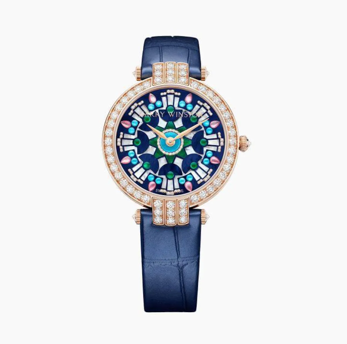 قدمت علامة هاري وينستون Harry Winston هذه الساعة الجذابة المصممة من الذهب الوردي عيار 18 قيراطاً ومصممة بألوان جريئة وأشكال هندسية مزينة بألماس هاري وينستون الشهير وهي ساعة ساحرة مستوحاة من اسمها الساحري، وجاءت متصلة بعرق اللؤلؤ الأبيض المطرز بعرق اللؤلؤ الوردي والفيروز والأخضر وجاء سوار الساعة من جلد التمساح اللؤلؤي الأزرق الداكن مع ميناء الساعة المرصع بالماس المرصوف بشكل مستدير بالكامل .