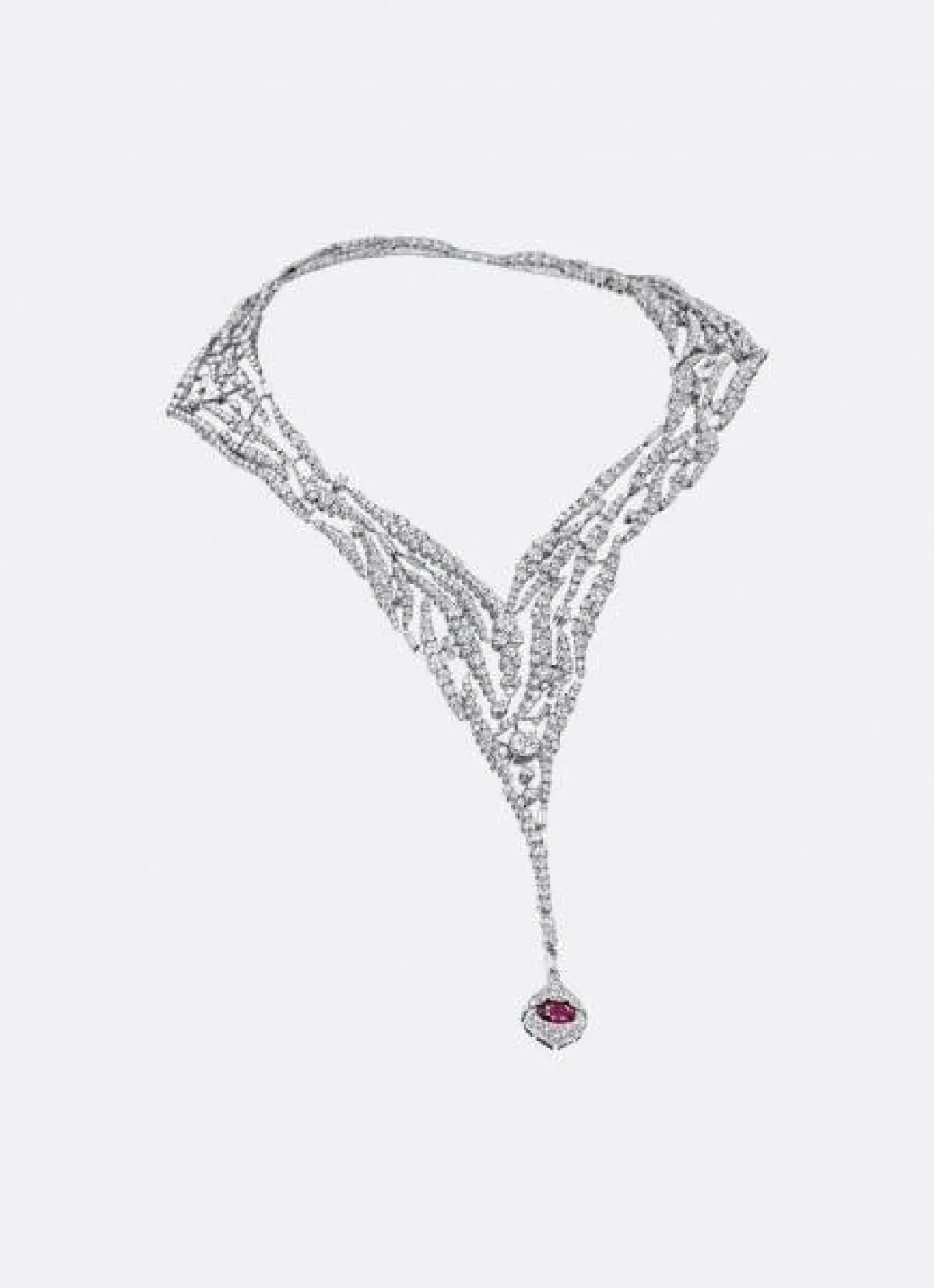 لإطلالة فخمة لافتة للأنظار انتقي هذا التصميم من علامة Breguet لعقد مصنوع من الذهب الأبيض عيار 18 قيراطاً مرصع بوسادة وباغيت وألماس بقطع البريانت وجاء العقد بشكل عريض وأنيق لكي يملئ العنق بأسلوب جذاب ويسندل منه حجر صغير من الياقوت الأحمر وبإطار حوله من الذهب الأبيض على شكل دائرة .