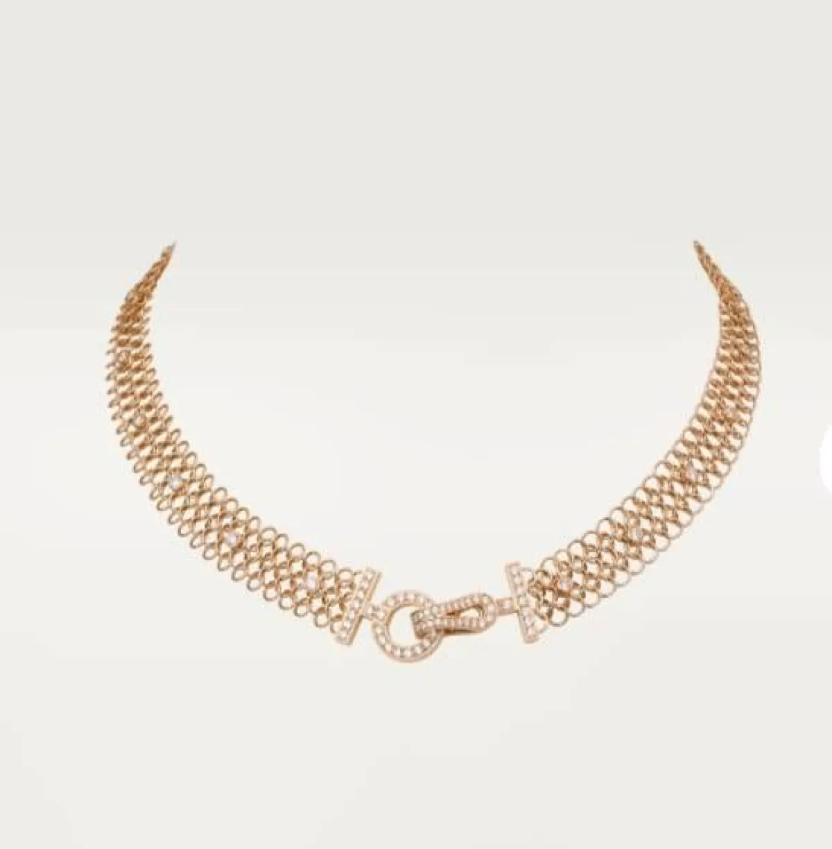 إذا كنتِ تبحثين عن عقد يناسب حفلات الزفاف يمكنك ارتداء هذا التصميم من علامة كارتييه Cartier لعقد مصمم من الذهب الوردي عيار 18 قيراطاً ومرصع ب 78 ماسة بقطع البريانت وجاء بأسلوب عريض مستدير وتنسدل منه دائرة وعقد صغير مطلي بالذهب الوردي والألماس اللامع .