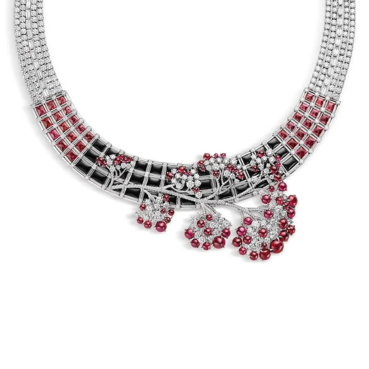 لسهراتك المسائية الفاخرة اخترنا لكِ هذا التصميم من علامة شوميه Chaumet لعقد مصمم من الذهب الأبيض عيار 18 قيراطاً مرصع بحجر الأونيكس الأسود والياقوت المقطوع كابشون وعقيق الروديليت المربعة المقطعة والماس بقطع البريانت وقطع الباغيت وتنسدل منه قطع تشبه الأزهار بأسلوب أنيق ملفوفاً بشكل أنثوي .