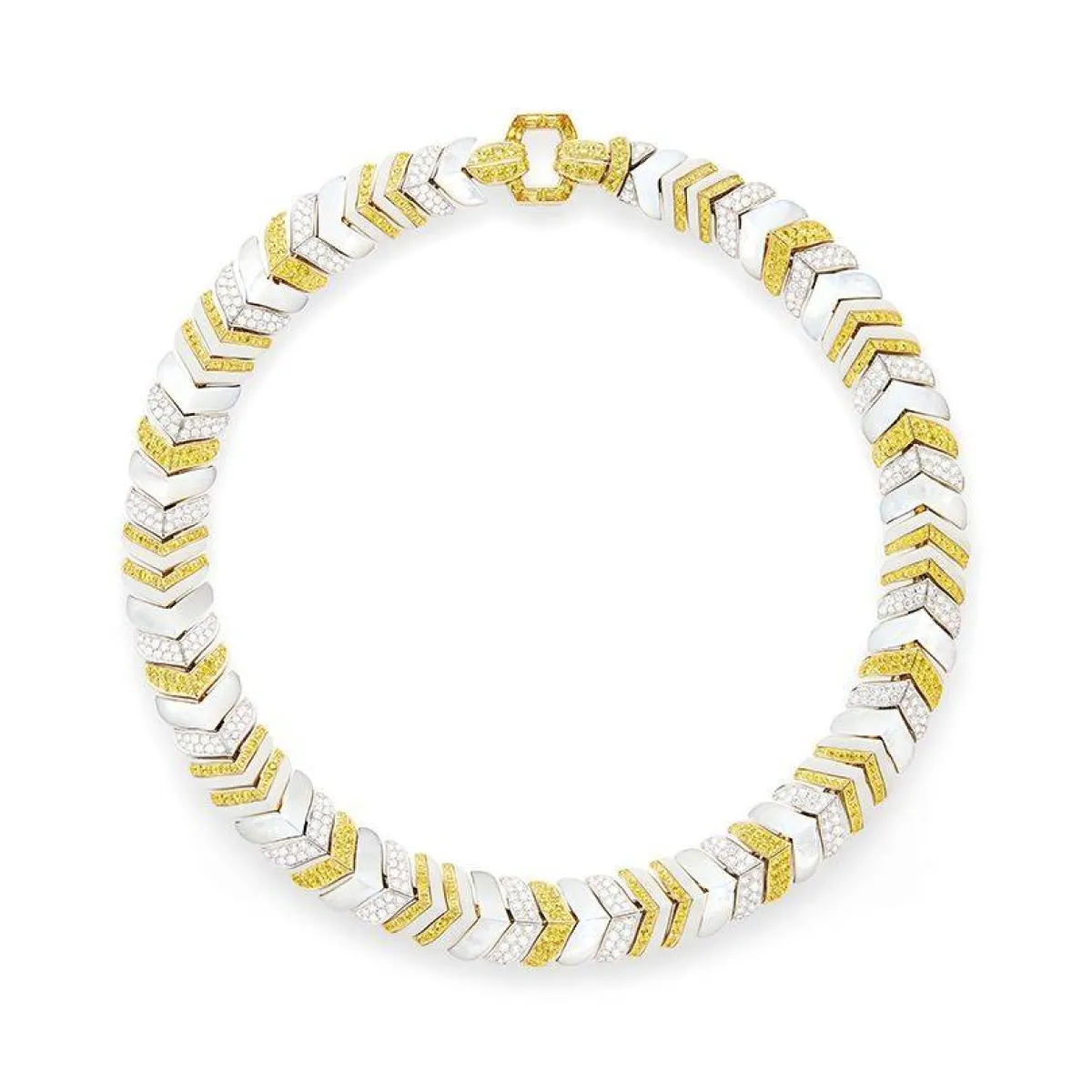 قدمت علامة بوشرون Boucheron العديد من تصاميم العقود العريضة التي تناسب المرأة الكلاسيكية وقد أعجبنا هذا العقد المصمم من الذهب الأبيض والأصفر عيار 18 قيراطاً ومرصع بالياقوت الأصفر والعقيق وعرق اللؤلؤ وتُعيد خطوط آرت ديكو تفسير شكل شيفرون وهو تصميم باريسي وجاء العقد مرصع بأحجار زفير الباغيت الأصفر .